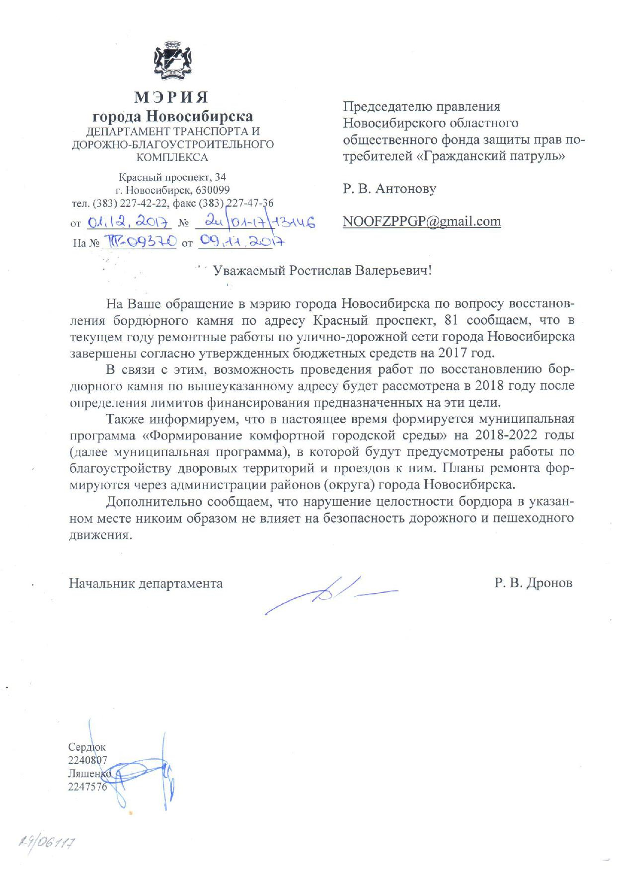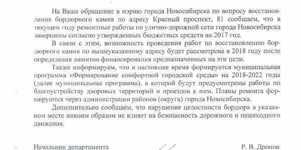 Номер жалобы:26522 Тип жалобы:Иные проблемы ЖКХ Название объекта:Управляющая Компания Регион:Новосибирская область Город:Новосибирск Адрес:Красный пр., 81 Описание жалобы:Сломан бордюр Статус: