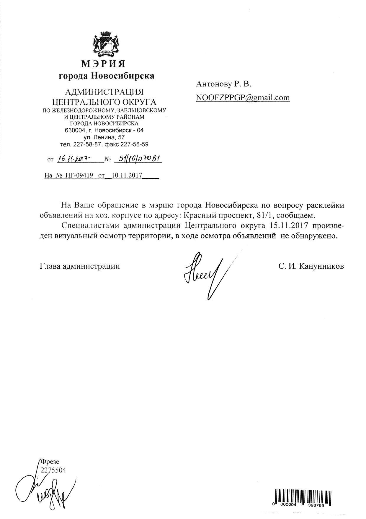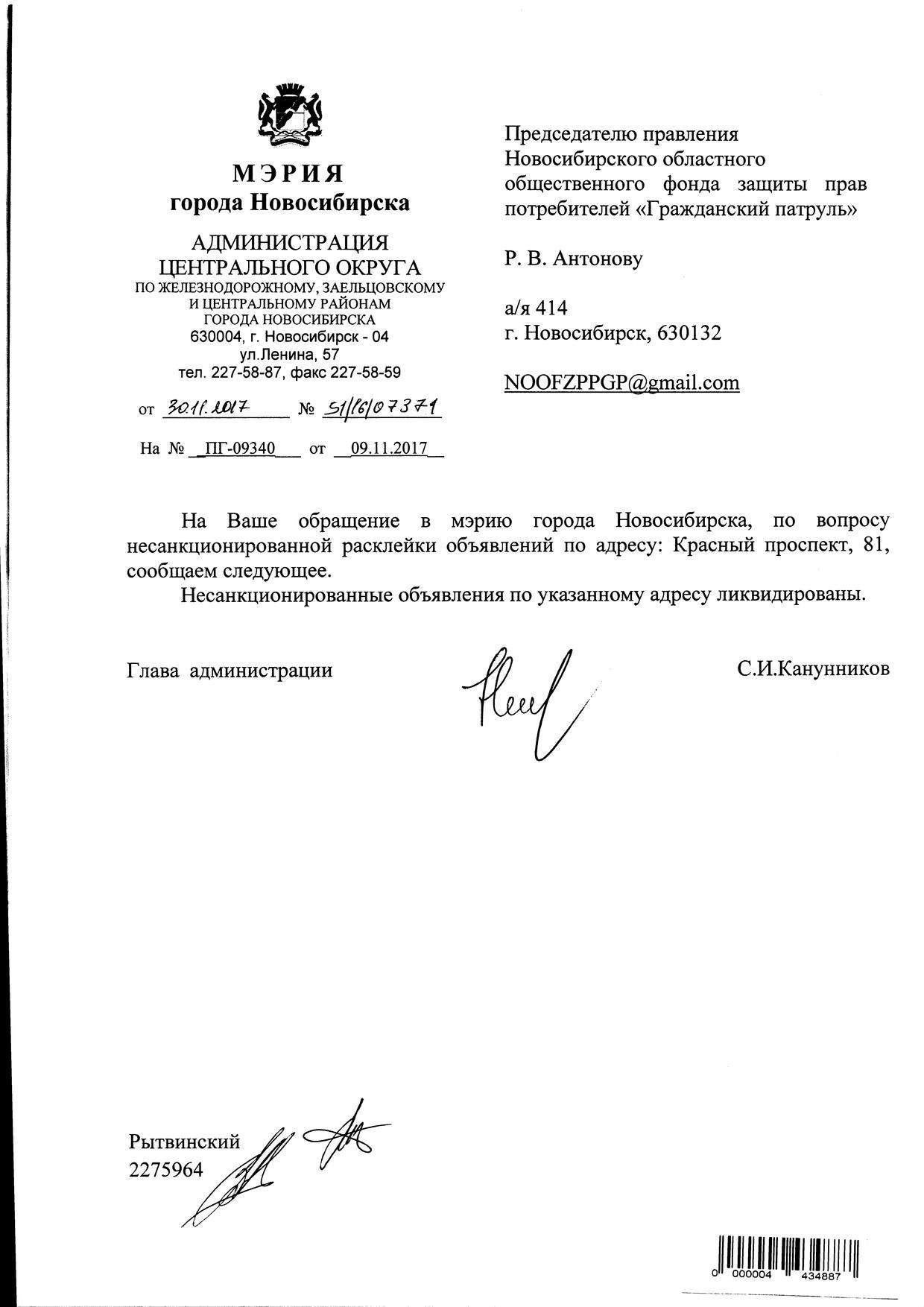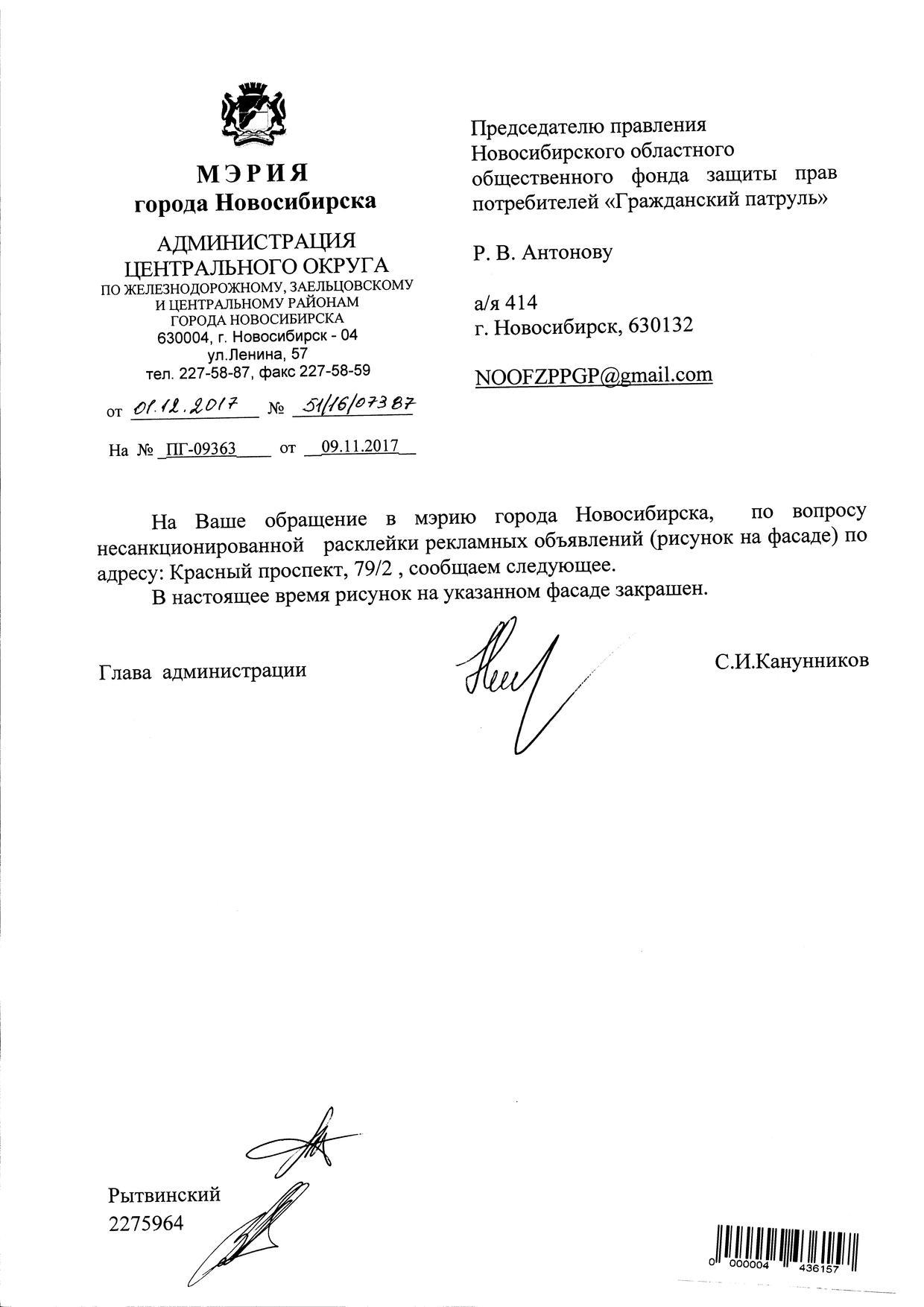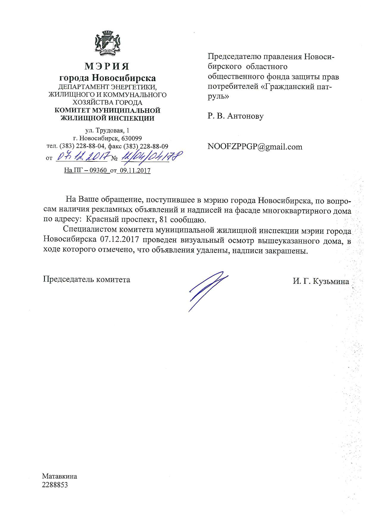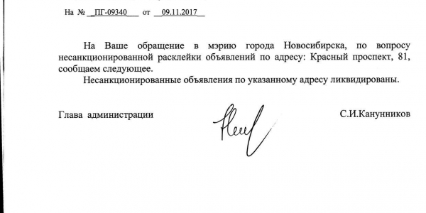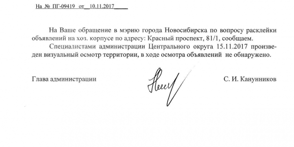 Номер жалобы:26534 Тип жалобы:Иные проблемы ЖКХ Название объекта:Управляющая Компания Регион:Новосибирская область Город:Новосибирск Адрес:Красный пр., 81/1 Описание жалобы:Объявление на хозяйственном корпусе Статус: