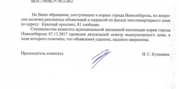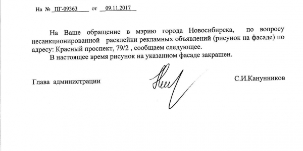 Номер жалобы:26523 Тип жалобы:Иные проблемы ЖКХ Название объекта:Управляющая Компания Регион:Новосибирская область Город:Новосибирск Адрес:Красный пр., 81 Описание жалобы:Надписи на фасаде Статус: