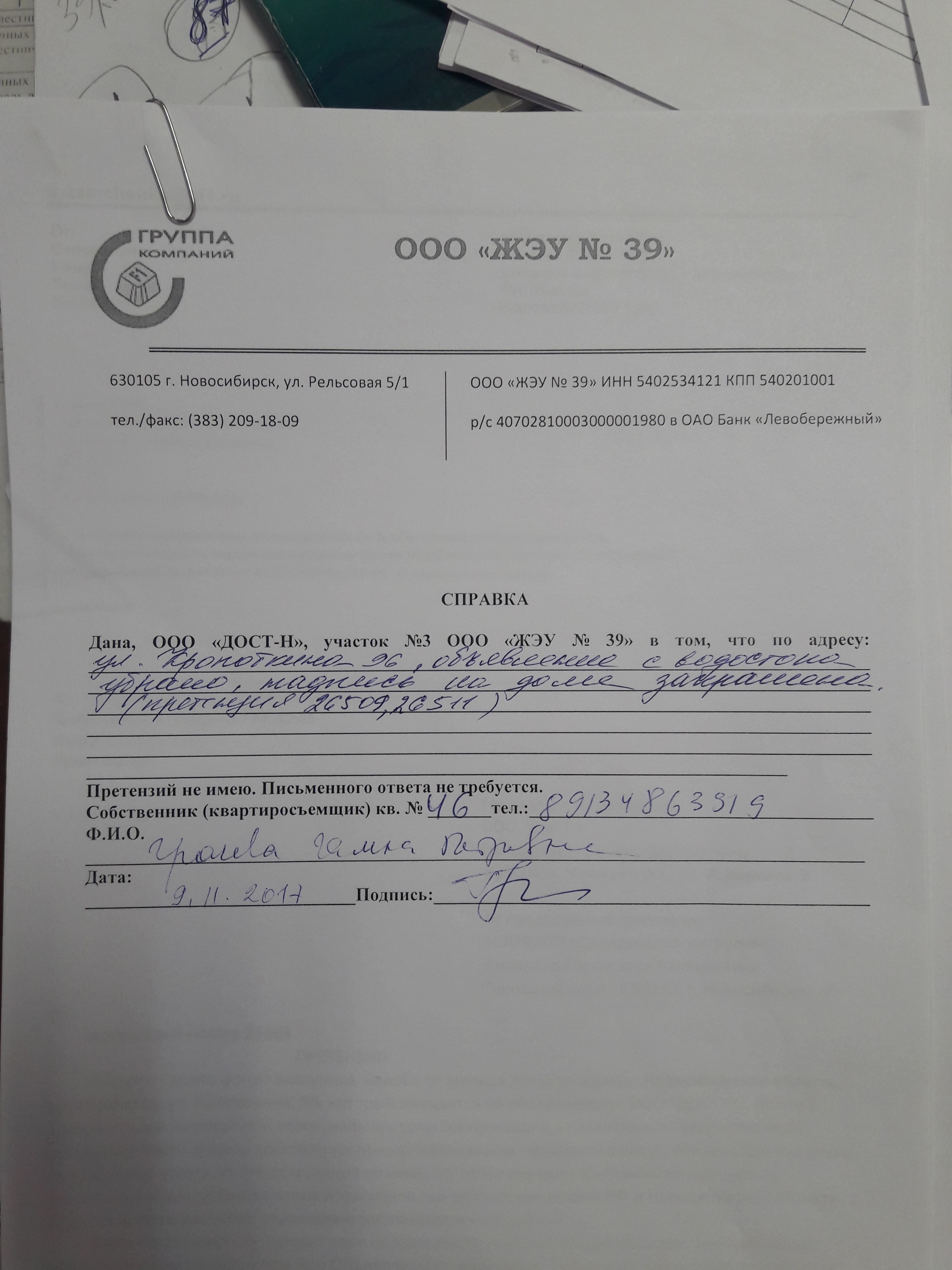 Номер жалобы:26515 Тип жалобы:Иные проблемы ЖКХ Название объекта:Управляющая Компания Регион:Новосибирская область Город:Новосибирск Адрес:ул. Кропоткина, 100 Описание жалобы:Объявления на водостоке Статус: