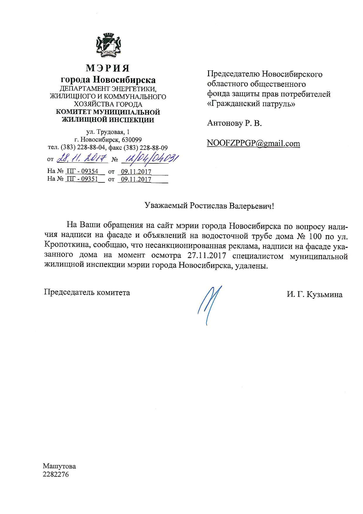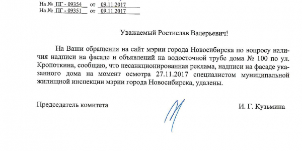 Номер жалобы:26512 Тип жалобы:Иные проблемы ЖКХ Название объекта:Управляющая Компания Регион:Новосибирская область Город:Новосибирск Адрес:ул. Кропоткина, 96 Описание жалобы:Объявления на хозяйственном корпусе Статус: