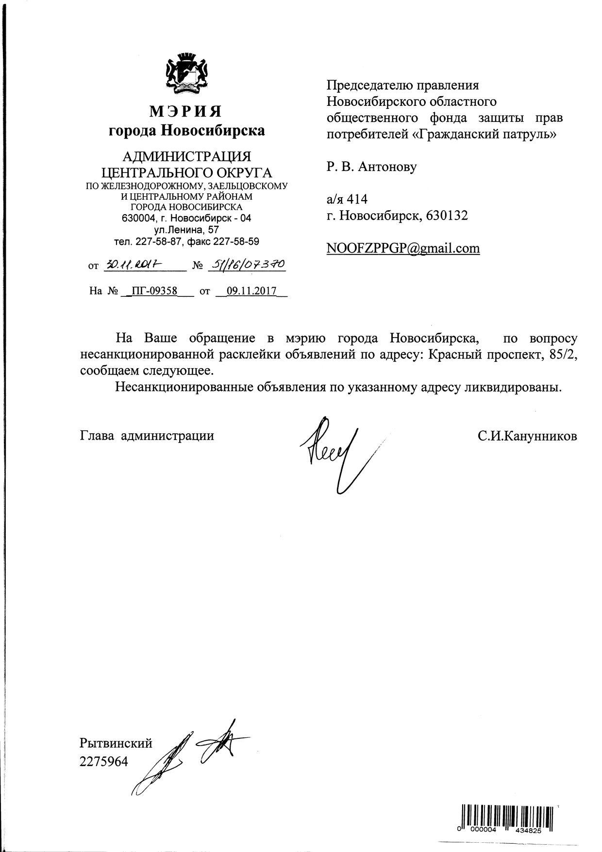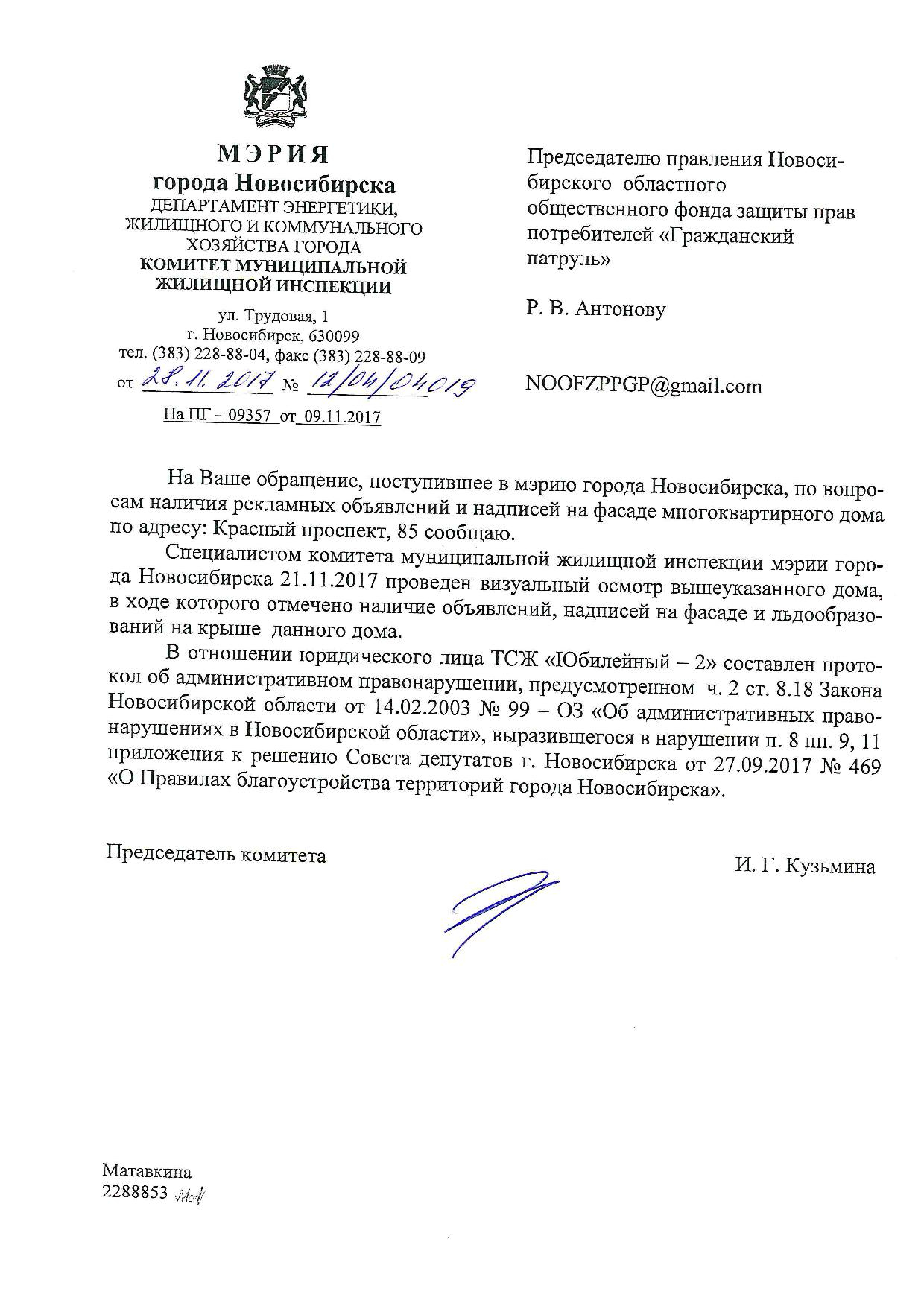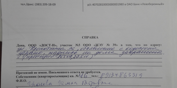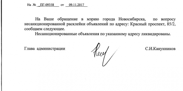 Номер жалобы:26518 Тип жалобы:Иные проблемы ЖКХ Название объекта:Управляющая Компания Регион:Новосибирская область Город:Новосибирск Адрес:Красный пр., 85/2 Описание жалобы:Надписи и объявления в неположенном месте Статус: