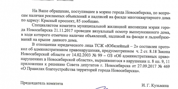 Номер жалобы:26520 Тип жалобы:Иные проблемы ЖКХ Название объекта:Управляющая Компания Регион:Новосибирская область Город:Новосибирск Адрес:Красный пр., 85 Описание жалобы:Надписи на фасаде дома Статус: