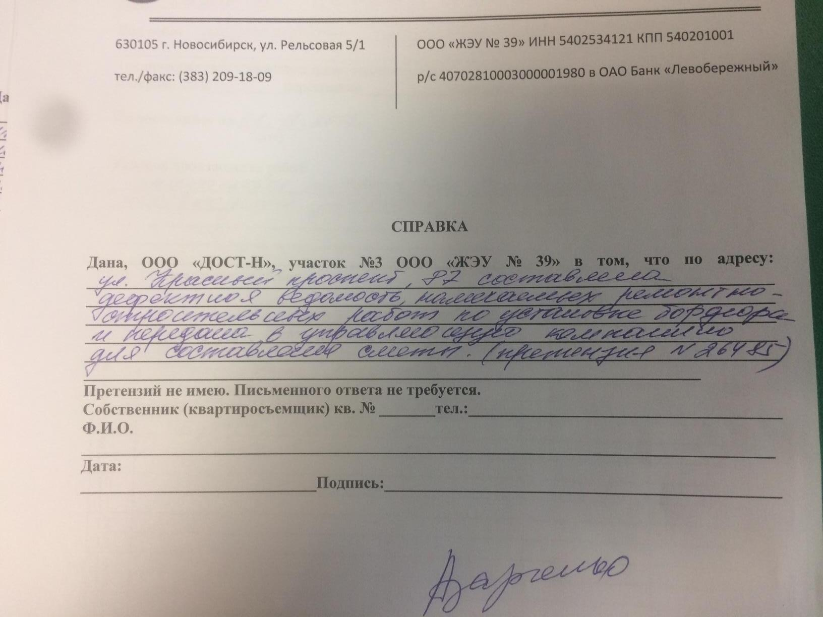 Номер жалобы:26477 Тип жалобы:Иные проблемы ЖКХ Название объекта:Управляющая Компания Регион:Новосибирская область Город:Новосибирск Адрес:ул. Дуси Ковальчук, 258/1 Описание жалобы:Объявления на хозяйственном корпусе Статус: