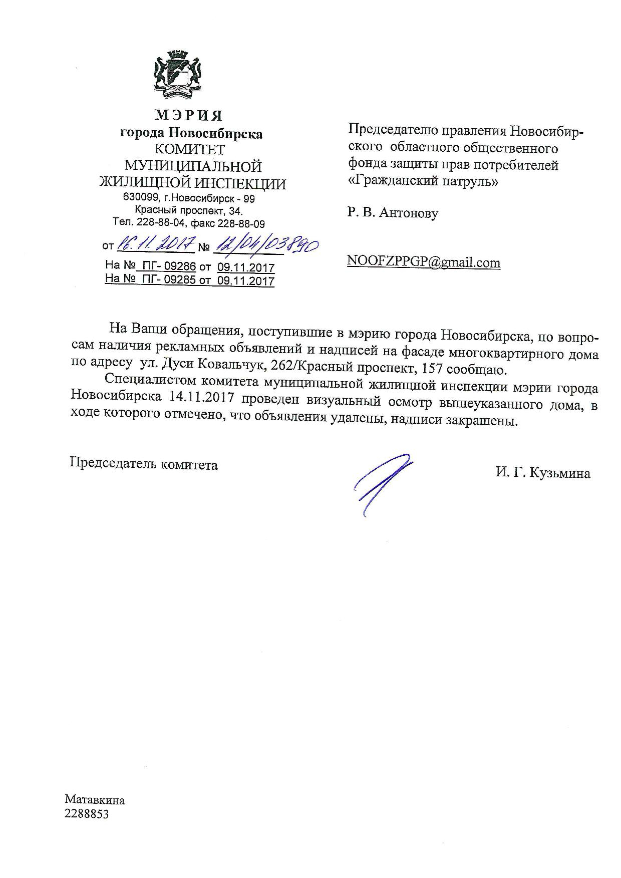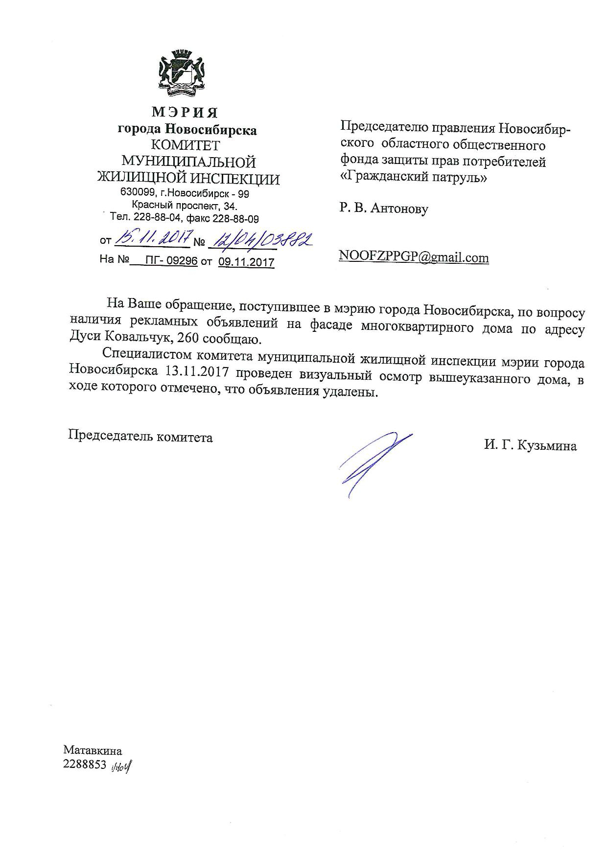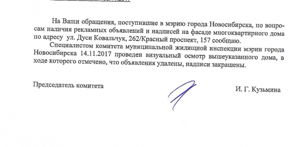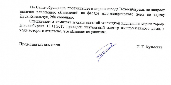 Номер жалобы:26474 Тип жалобы:Иные проблемы ЖКХ Название объекта:Управляющая Компания Регион:Новосибирская область Город:Новосибирск Адрес:ул. Дуси Ковальчук, 260/1 Описание жалобы:Дуси Ковальчук 260/1 объявления на хозяйственном корпусе Статус: