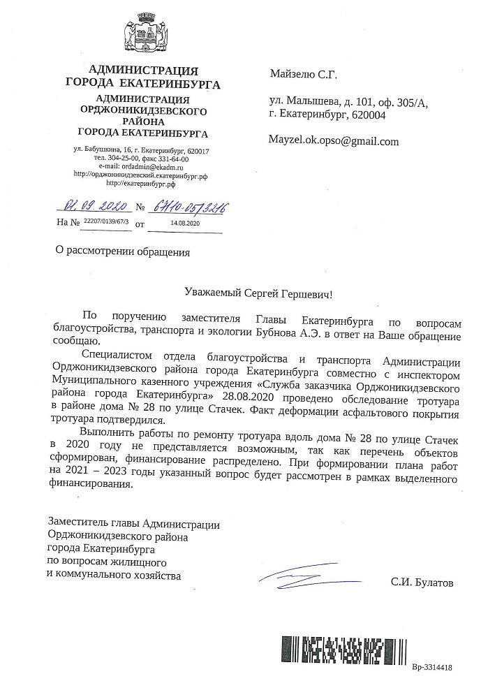Номер жалобы:67906 Тип жалобы:Прочее Название объекта:мэрия Регион:Свердловская область Город:Екатеринбург Адрес:улица Стачек, 28 Описание жалобы:Необходим ремонт тротуара. Статус: