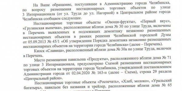 Номер жалобы:67765 Тип жалобы:Прочее Название объекта: Регион:Челябинская область Город:Челябинск Адрес:улица Труда Описание жалобы:Незаконные точки торговли(ларьки),на отрезке по улице 3-го Интернационала от ул.Труда,до ул.Нагорная. Стоят на тротуаре,мешают движению пешеходов. Минимум пять ларьков. Статус: