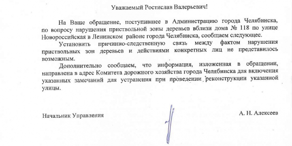 Номер жалобы:67779 Тип жалобы:Прочее Название объекта:Администрация города Челябинска Регион:Челябинская область Город:Челябинск Адрес:Новороссийская улица, 118 Описание жалобы:На остановке возле Новороссийской 118 находится дерево, полностью закатанное в асфальт. Согласно п.п. 5 п. 193 Правил благоустройства территории города Челябинска, утвержденных решением Челябинской городской Думы №16/32 от 22.12.2015: "при производстве работ по строительству, реконструкции, ремонту объектов капитального строительства лицо, их осуществляющее, обязано при асфальтировании, мощении дорог и тротуаров соблюдать размеры приствольной грунтовой зоны: вокруг деревьев – 2 x 2 метра, вокруг кустарников – 1,5 x 1,5 метра." Требую восстановить необходимую приствольную грунтовую зону вокруг дерева во избежании его гибели.