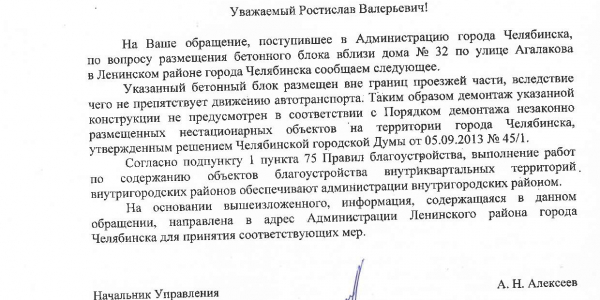 Номер жалобы:67825 Тип жалобы:Прочее Название объекта: Регион:Челябинская область Город:Челябинск Адрес:Черкасская улица Описание жалобы:Заместителю главы Челябинска по городской среде Александру Егорову.
