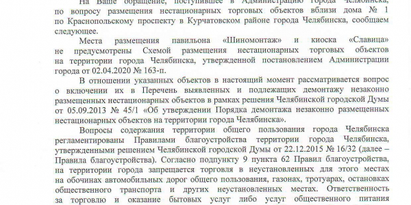 Номер жалобы:67857 Тип жалобы:Прочее Название объекта: Регион:Челябинская область Город:Челябинск Адрес:Краснопольский проспект, 1 Описание жалобы:Незаконные ларьки , закрывает обзор при выезде со двора Статус: