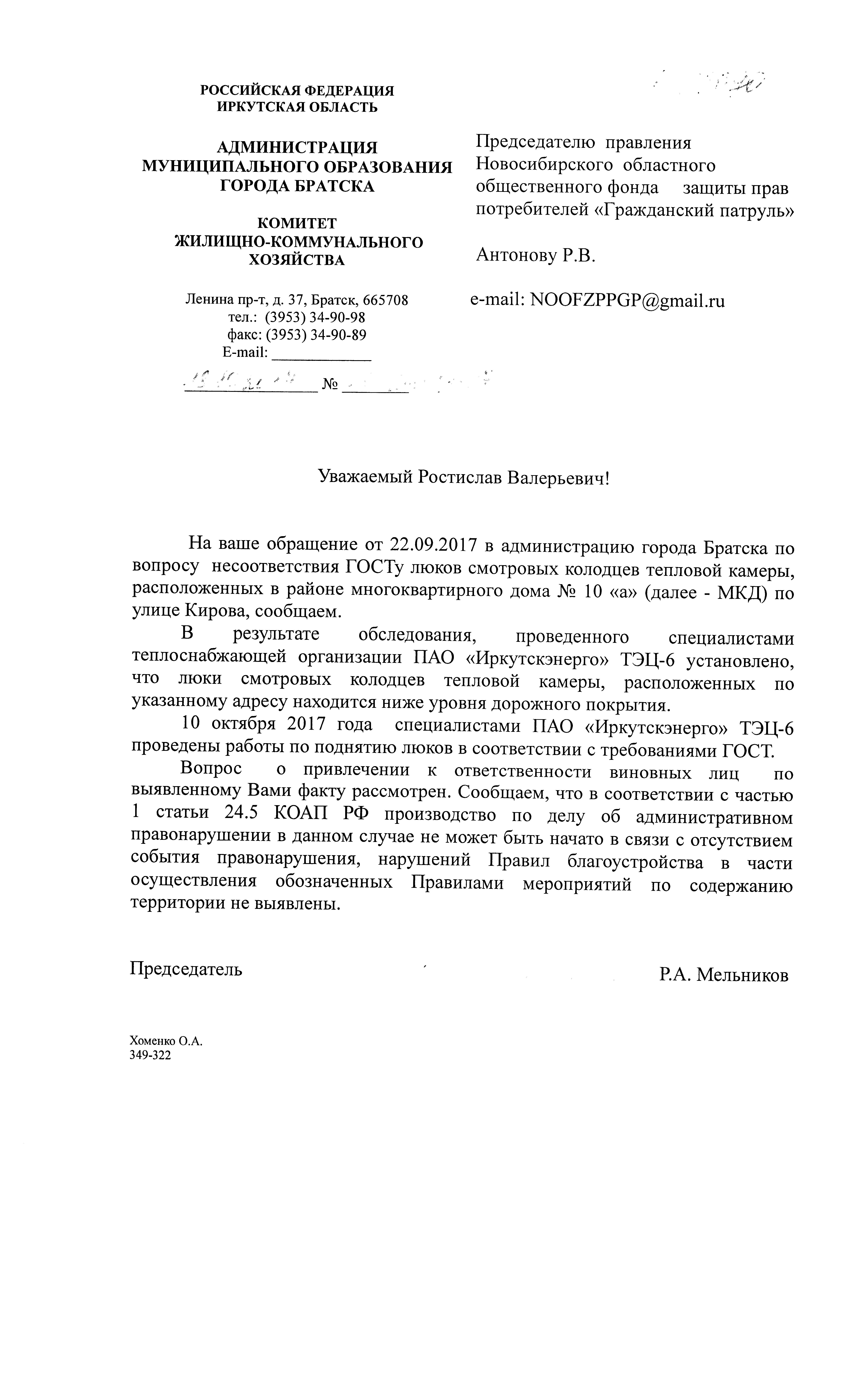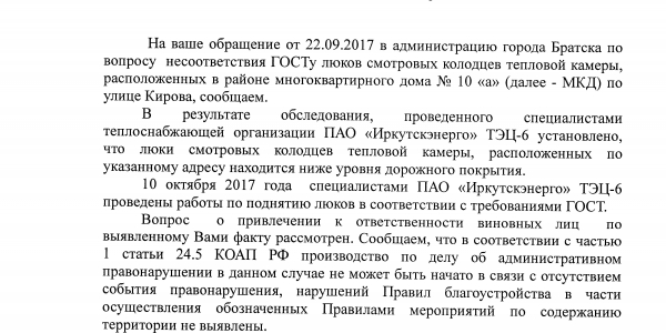 Номер жалобы:25090 Тип жалобы:Иные проблемы ЖКХ Название объекта:ООО УК "Жилсервис" Регион:Иркутская область Город:Братск Адрес:ул. Кирова, 10а Описание жалобы:На придомовой дороге возле второго подъезда канализационные люки расположены ниже уровня асфальта, в образовавшихся углублениях скапливается вода Статус: