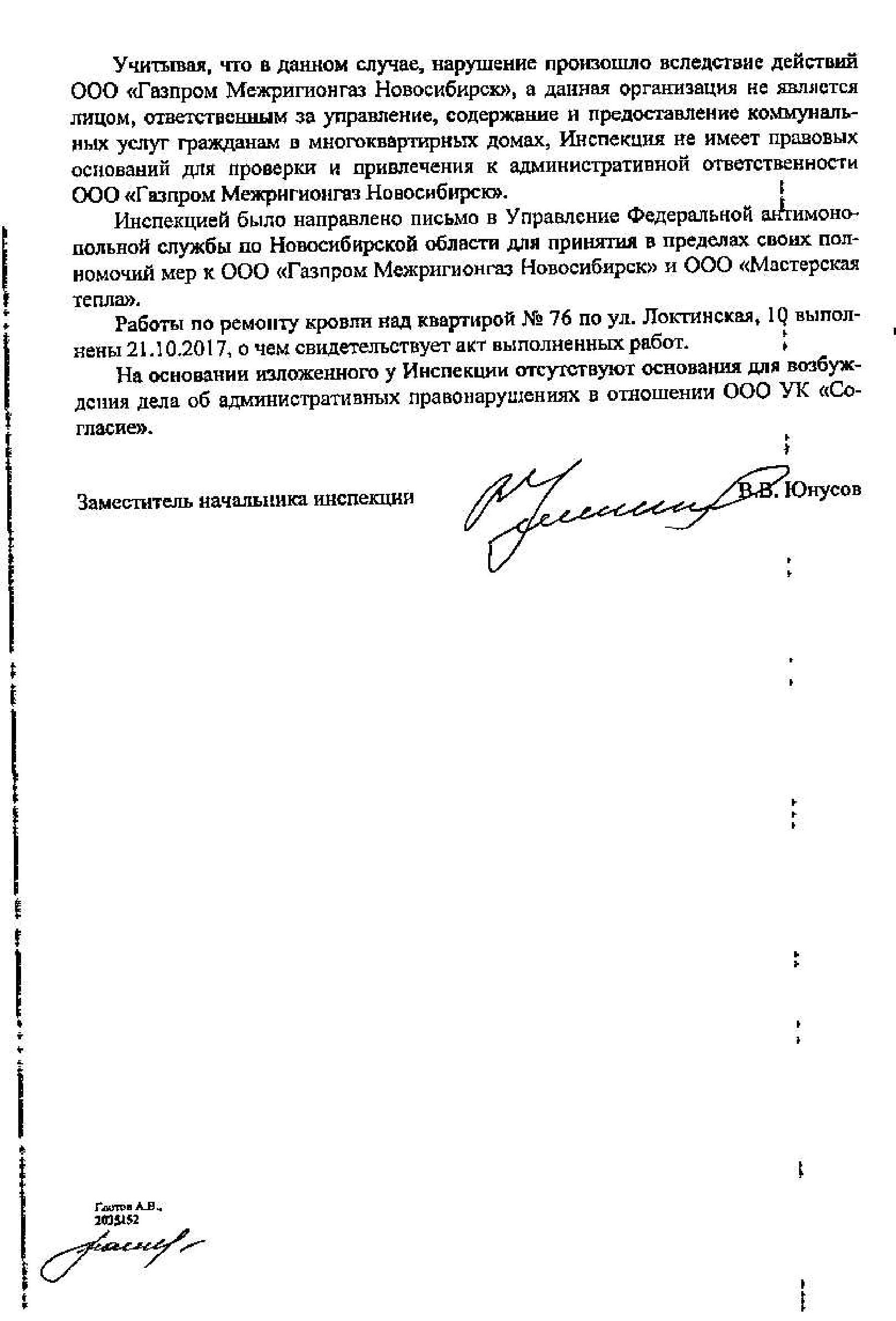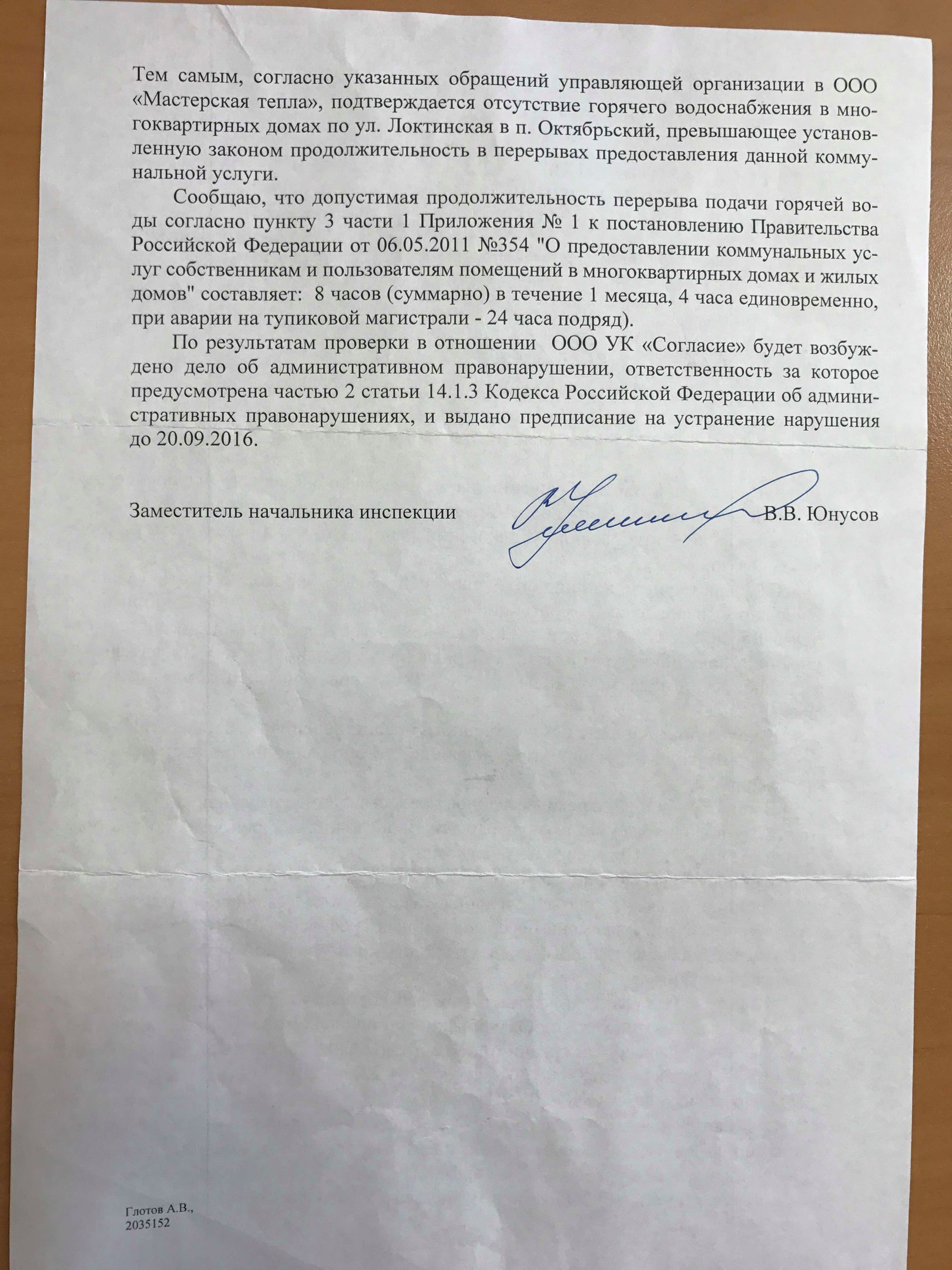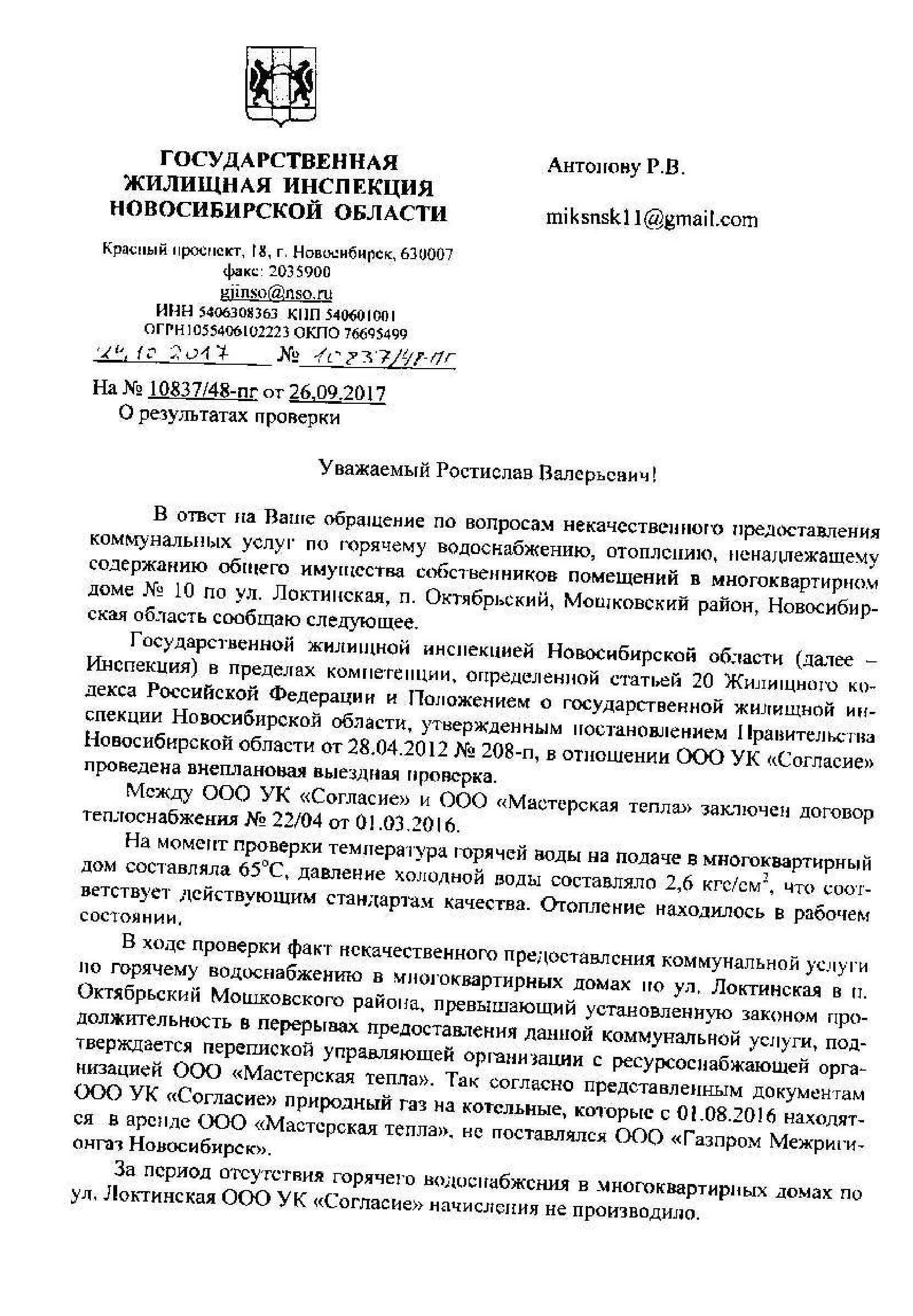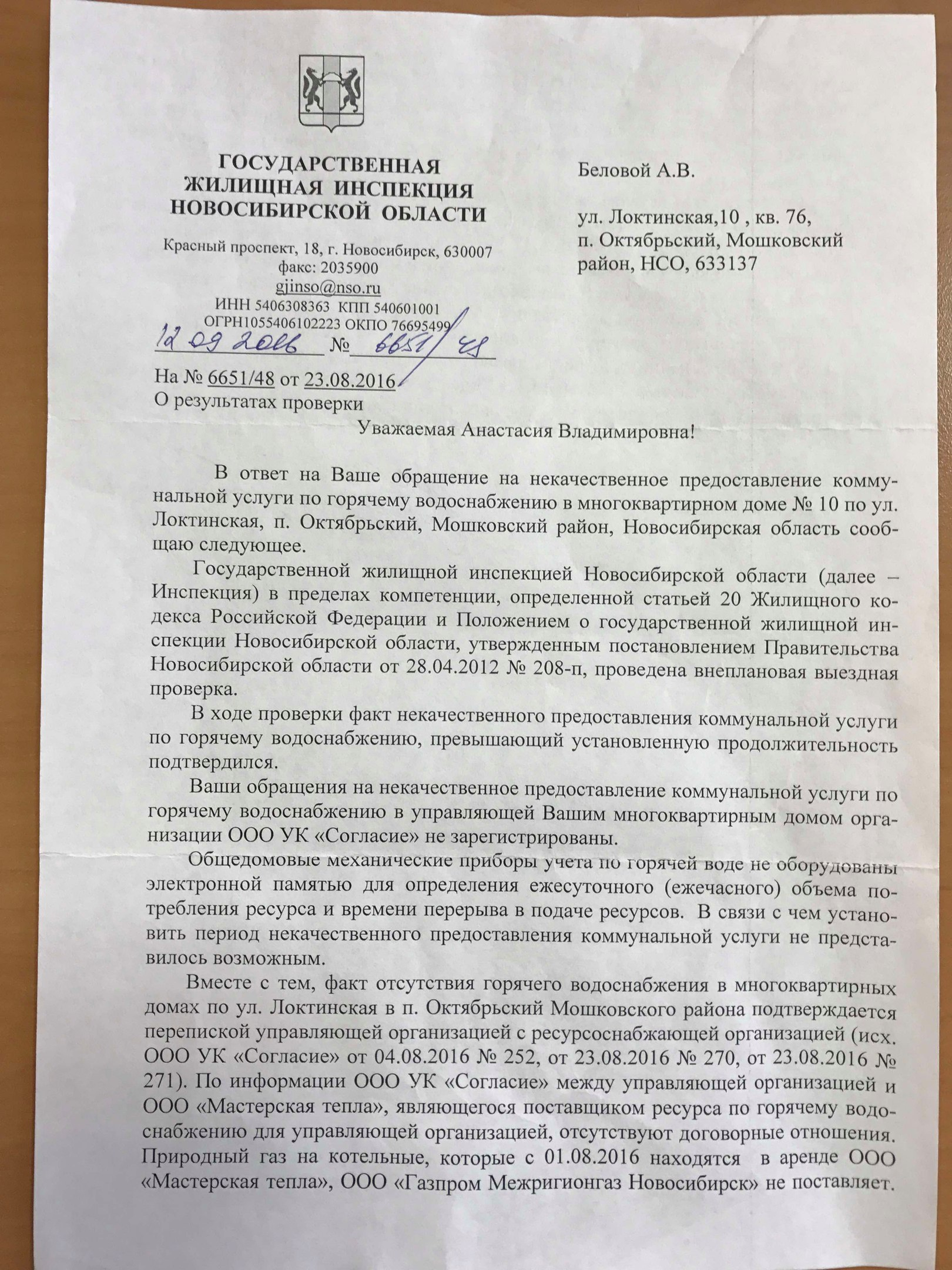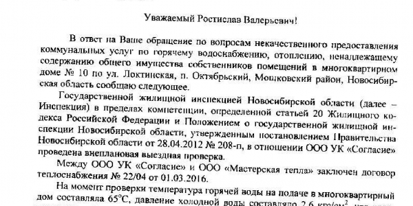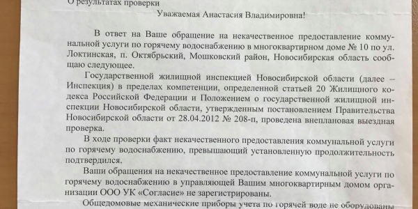 Номер жалобы:25100 Тип жалобы:Проблемы ЖКХ / дворы - Иные проблемы ЖКХ Название объекта: Регион:Новосибирская область Город:Мошковский район, п. Октябрьский Адрес:поселок Октябрьский, ул. Локтинская, 10, кв. 76 Описание жалобы:Течет крыша, нет договора между Согласием и Мастерской тепла, незаконное собирание платы, нет горячей воды, угрозы срыва отопительного сезона Статус: