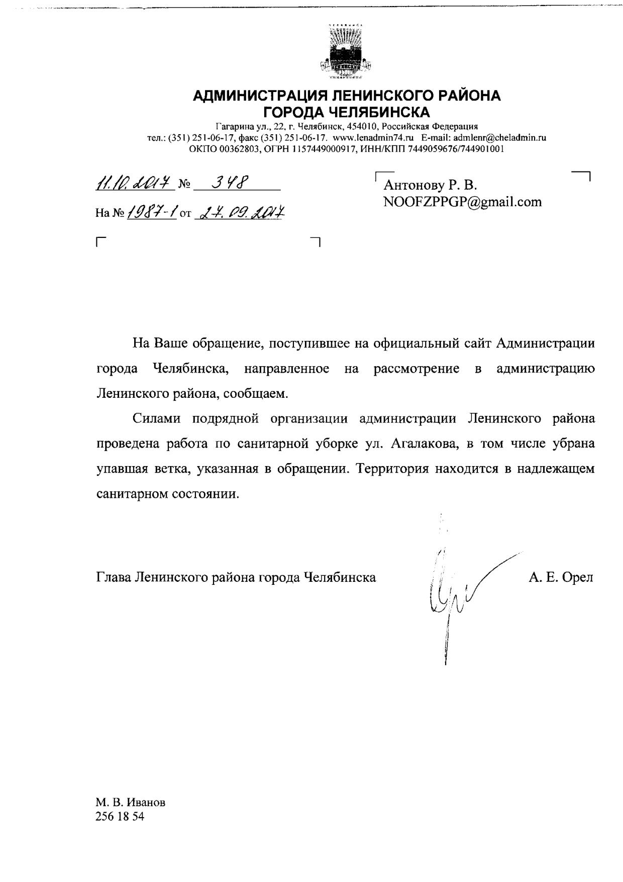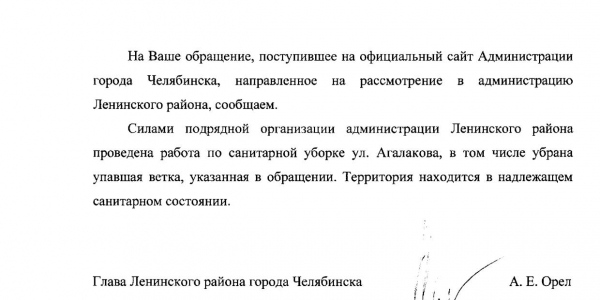 Номер жалобы:25156 Тип жалобы:Иные проблемы ЖКХ Название объекта:Горзеленстрой Регион:Челябинская область Город:Челябинск Адрес:ул. Агалакова, 46 Описание жалобы:По улице Агалакова ветром сбило большую ветку, которая мешает проходу пешеходов. ЖКХ бездействует целую неделю. Статус: