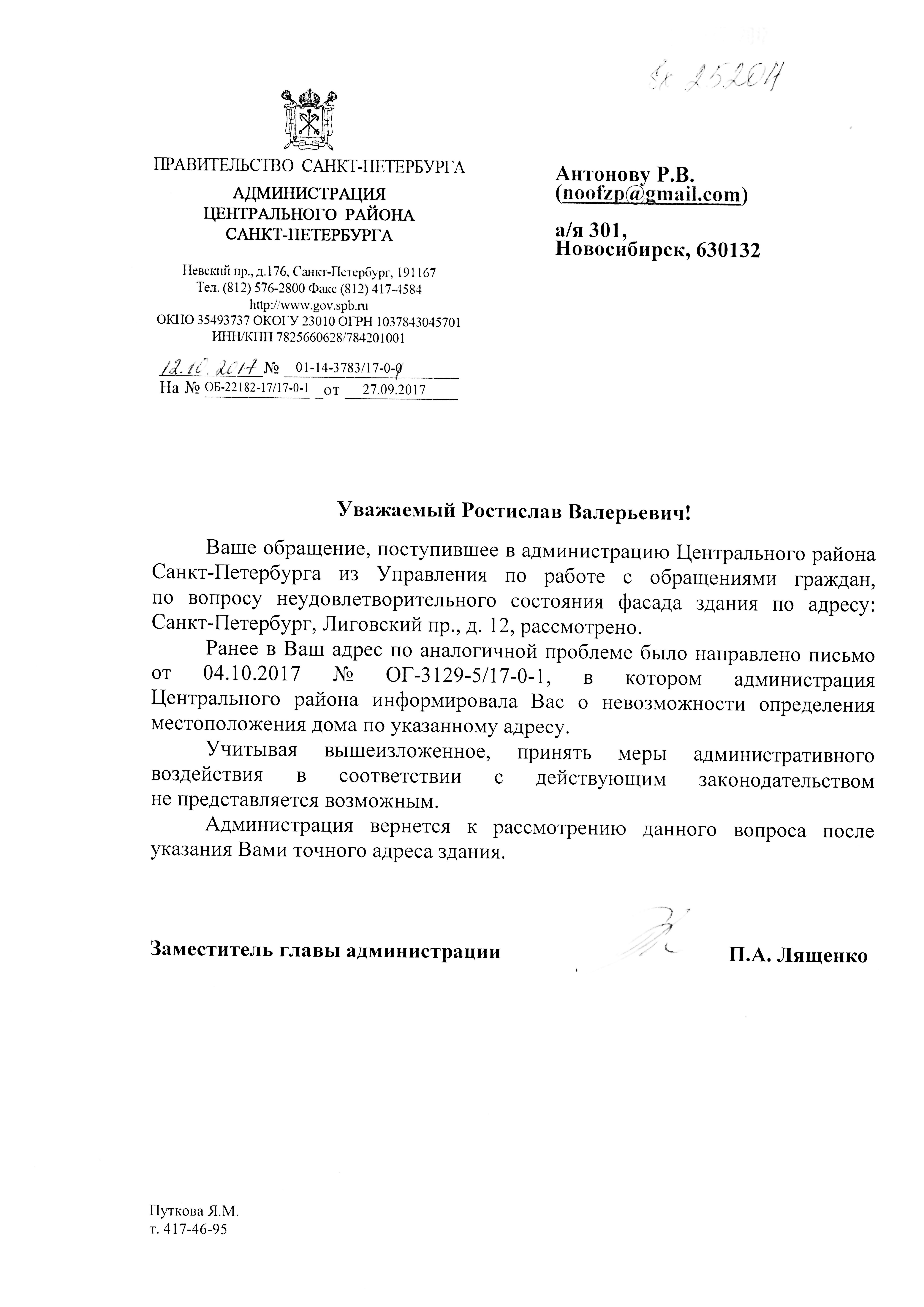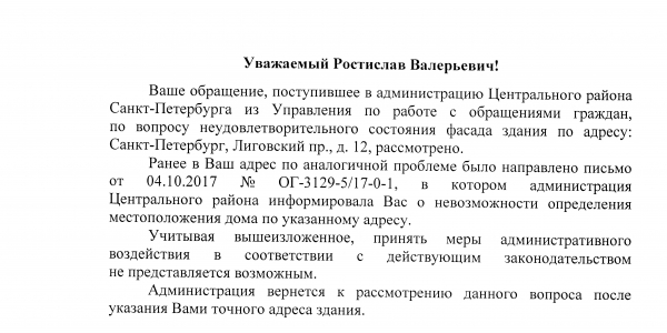 Номер жалобы:25204 Тип жалобы:Иные проблемы ЖКХ Название объекта:Районная Администрация Город:Санкт-Петербург Адрес:Санкт-Петербург, Лиговский проспект, 12 Описание жалобы:Фасад Статус: