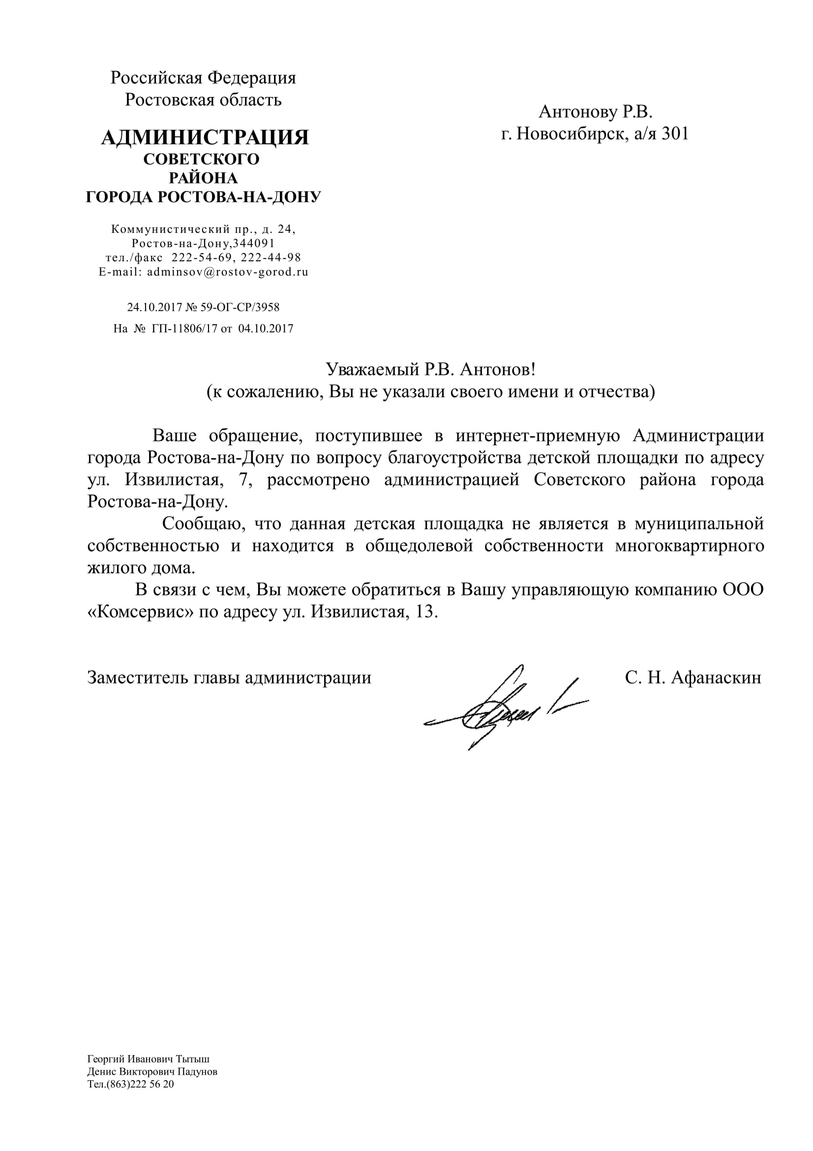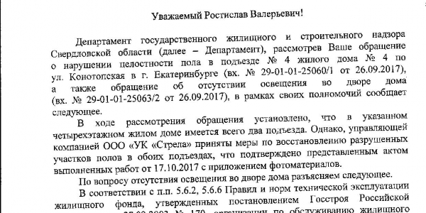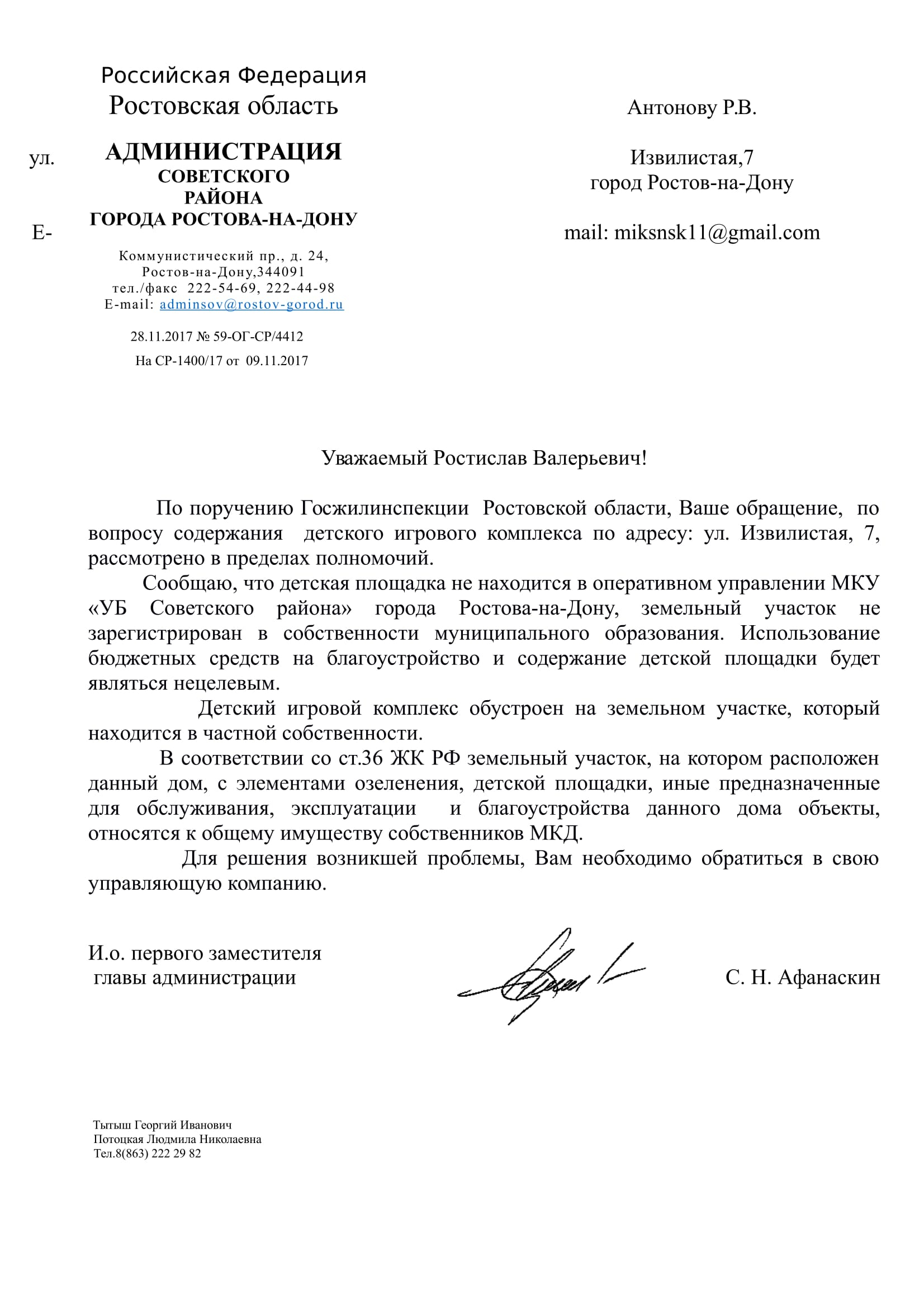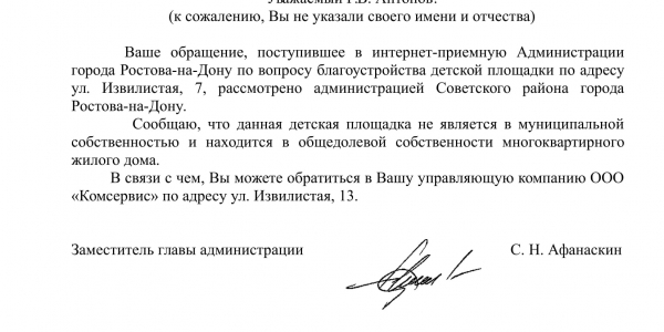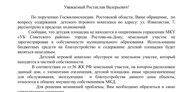 Номер жалобы:25291 Тип жалобы:Иные проблемы ЖКХ Название объекта:ООО "Комсервис" Город:Ростов-на-Дону Адрес:Ростов-на-Дону, улица Извилистая, 7 Описание жалобы:Спасибо за ответ, да вот только на детскую площадку песок завезли, а качели так и не сделали. В карусель круглой , почти с начала лета поломался подшипник , и до сегодняшнего дня 29.09.2017 года его не сделали. На других качелях деревянные покрытия частично оторваны. Очень просим помочь нашим деткам! Они с большим удовольствием ходят на эту площадку, но все приходит в негодность. И просим вас оборудовать песочницы детскими крышками , так как в песок ходят по своей нужде кошки и собаки, а дети играют их фекалиями вместе с песком. Статус: