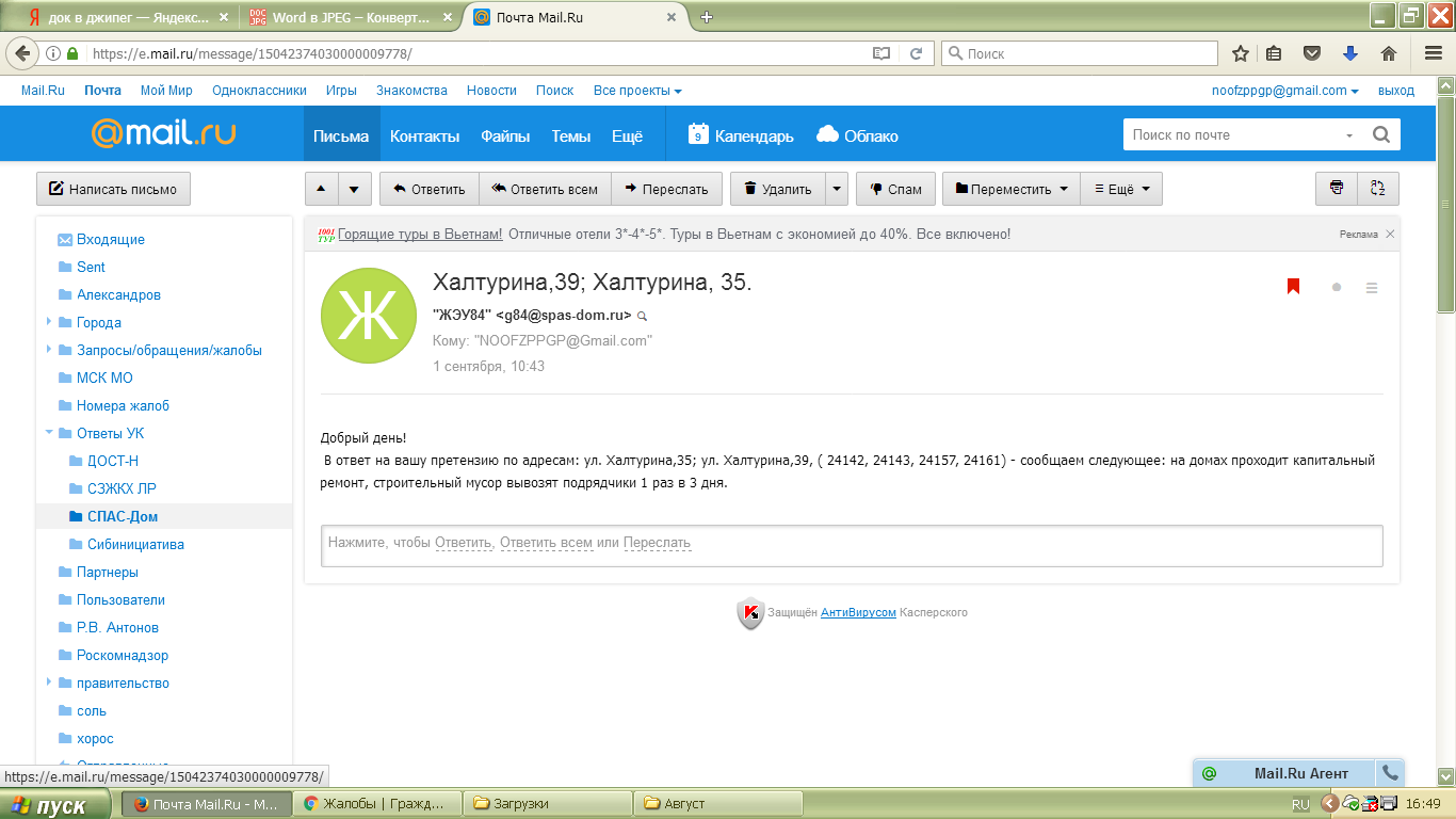 Номер жалобы:24161 Тип жалобы:Иные проблемы ЖКХ Название объекта:Управляющая Компания Город:Новосибирск Адрес:Новосибирск, улица Халтурина, 39 Описание жалобы:Строительный мусор Статус: