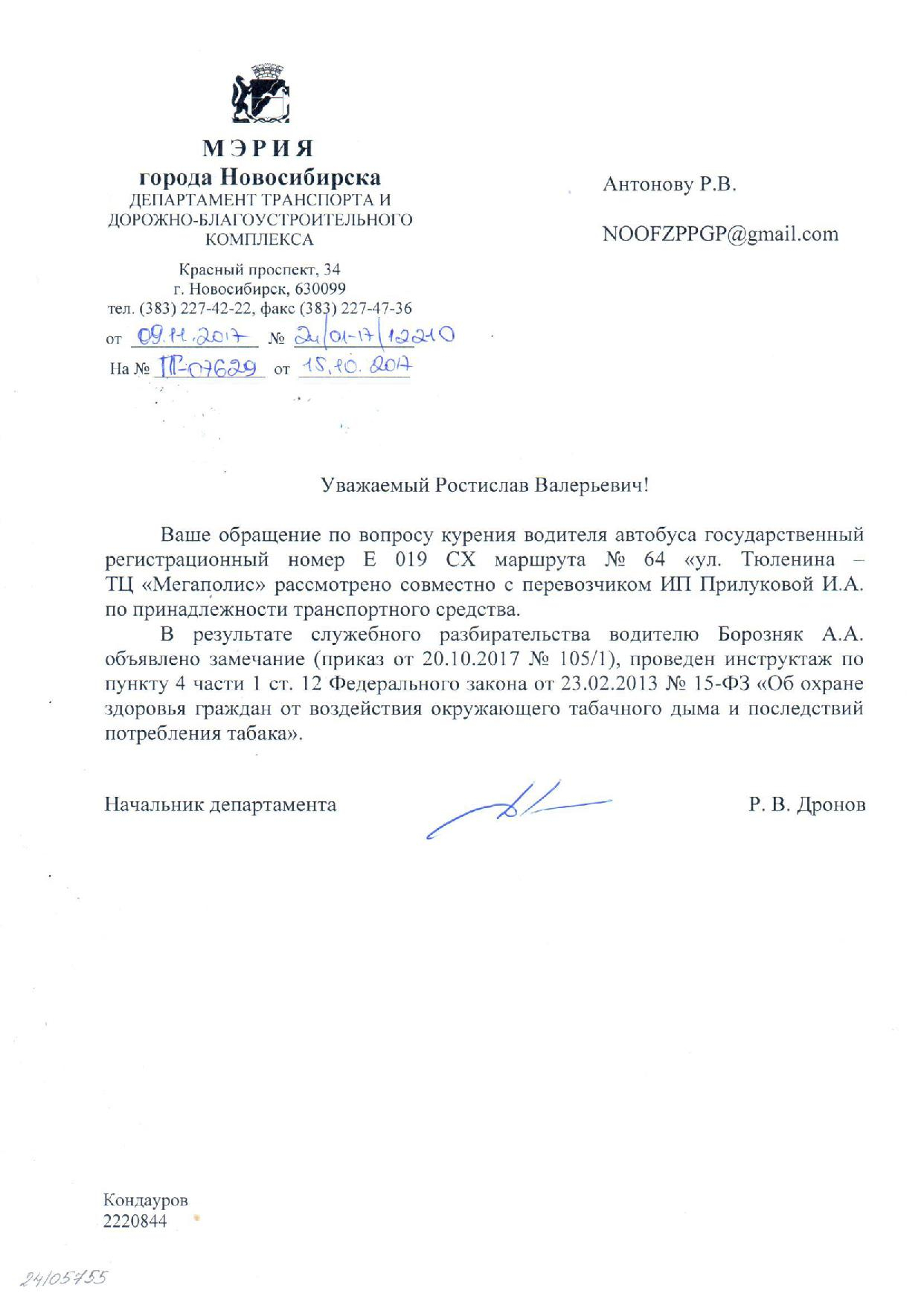 Номер жалобы:24374 Тип жалобы:Общественный транспорт Название объекта:Не Установлено Регион:Новосибирская область Город:Новосибирск Адрес:пл. Карла Маркса, 3 Описание жалобы:Водитель курит в салоне автобуса. Не допустимо такое на рабочем месте. 04.09.17, 13:45, маршрут 28. Ост. Маркса. У тц Версаль. Статус: