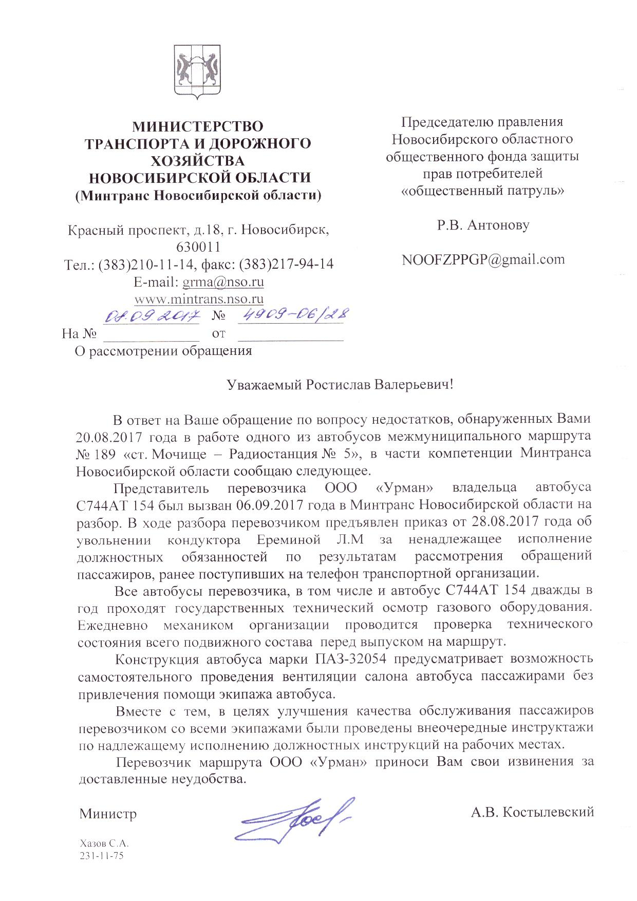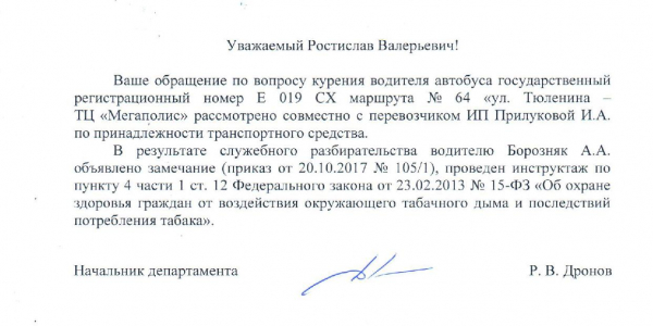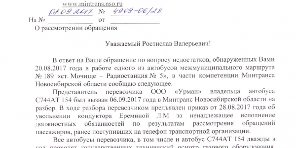 Номер жалобы:23664 Тип жалобы:Общественный транспорт Название объекта:не установлено Регион:Новосибирская область Город:Новосибирск Адрес:гоголя Описание жалобы:20.08 в 16 часов 50 минут следовал на автобусе N189 гн С 744 АТ 154 до ост. «Гоголя». Кондуктор разговаривал по телефону, не объявляя об остановках. В салоне очень сильно пахло газом. Очевидно потому, что он ездит на метане. На замечания, что запах газа сильный в салоне, и что не объявляются остановки, кондуктор отреагировала ровно, не предавая этому значения, продолжая беседу по телефону. Форточки автобуса были закрыты. Было очень душно.. пожилые пассажиры задыхались, им очень трудно дышать было. Прошу провести проверку, пригодно ли, исправно ли данное ТС (транспортное средство) соответствует ли нормам, и попросить компанию-перевозчик провести инструктаж с экипажем, о соблюдении правил перевозки пассажиров, обязанности кондуктора. Статус: