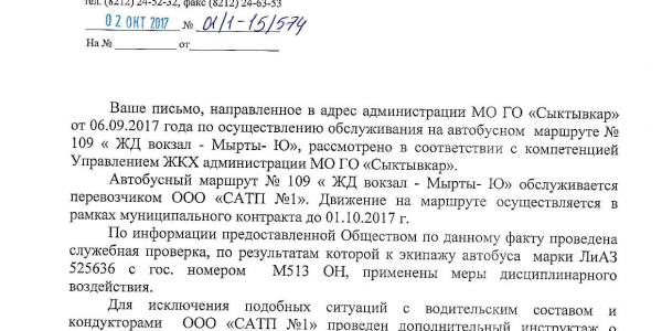 Номер жалобы:24411 Тип жалобы:Общественный транспорт Название объекта:ООО Сыктывкарское Автотранспортное Предприятие N1 Регион:Республика Коми Город:Сыктывкар Адрес:ул. Морозова, 91 Описание жалобы:Противно ездить в таком автобусе.Минут 20 стоял на конечной остановке,но салон в порядок перед рейсом не привели.Маршрут 109 автобус гос.номер М 513 ОН 11 Статус:
