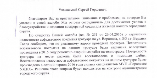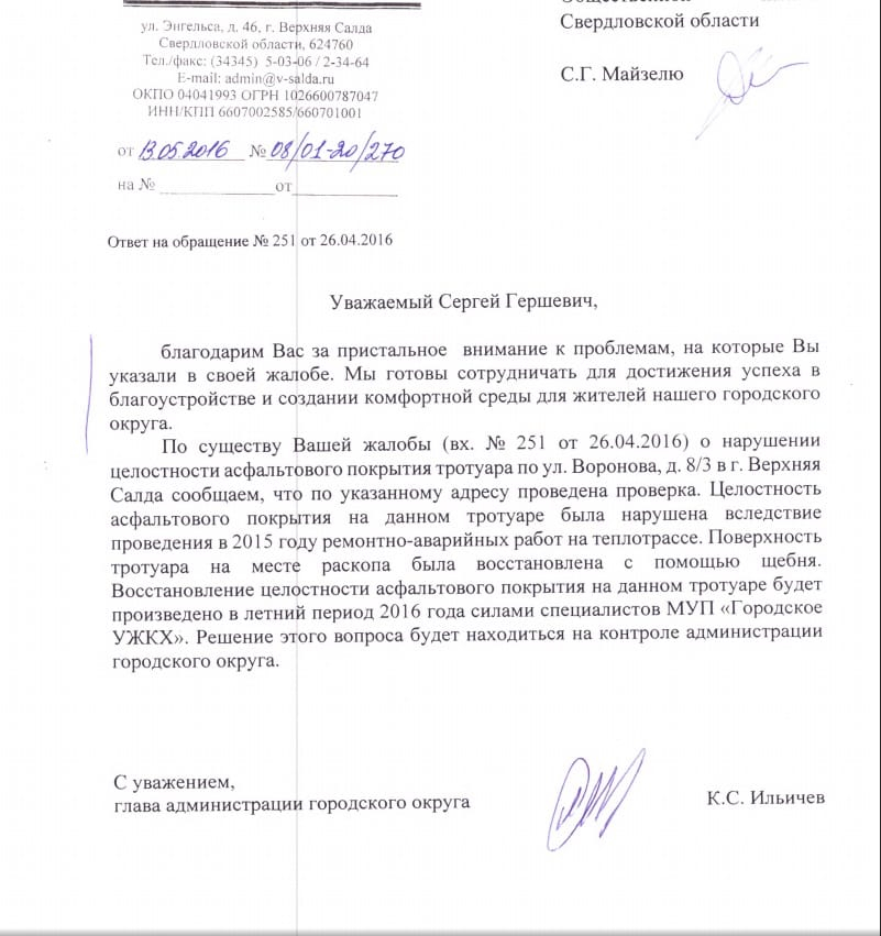 Номер жалобы:4136 Тип жалобы:Ямы на тротуарах Название объекта:Верхняя Салда Регион:Свердловская область Город:Верхняя Салда Адрес:ул. Воронова, 8/3 Описание жалобы:Необходимо восстановить тротуар после земляных работ Статус: