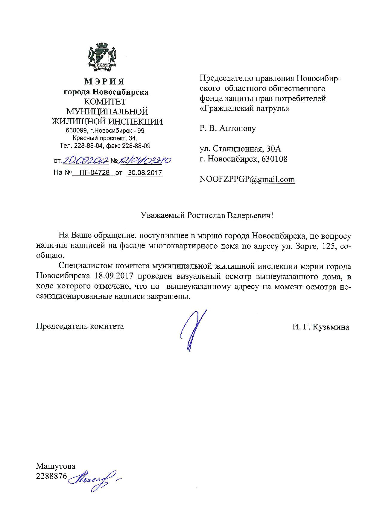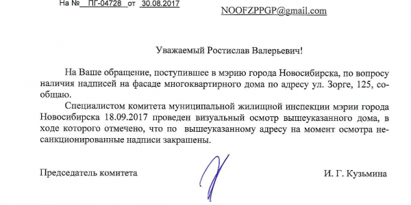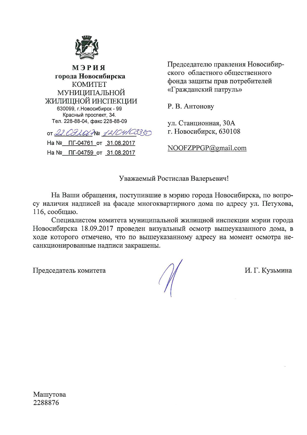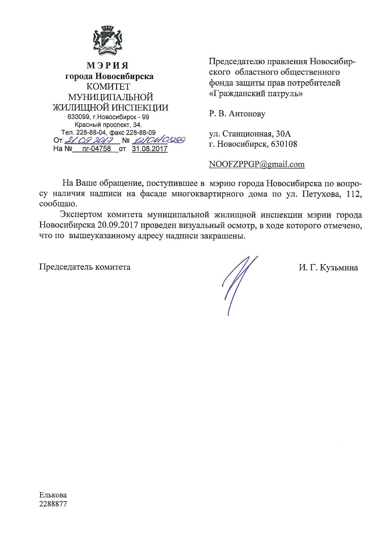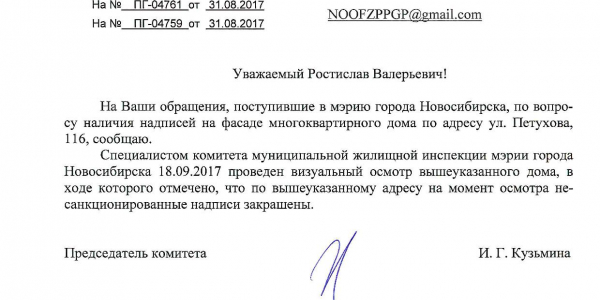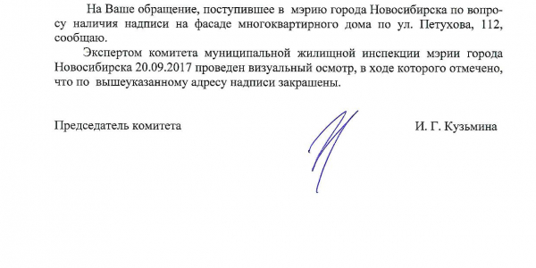 Номер жалобы:23975 Тип жалобы:Иные проблемы ЖКХ Название объекта:Управляющая Компания Город:Novosibirsk Адрес:Novosibirsk, улица Петухова, 106 Описание жалобы:Фасад разрисован Статус: