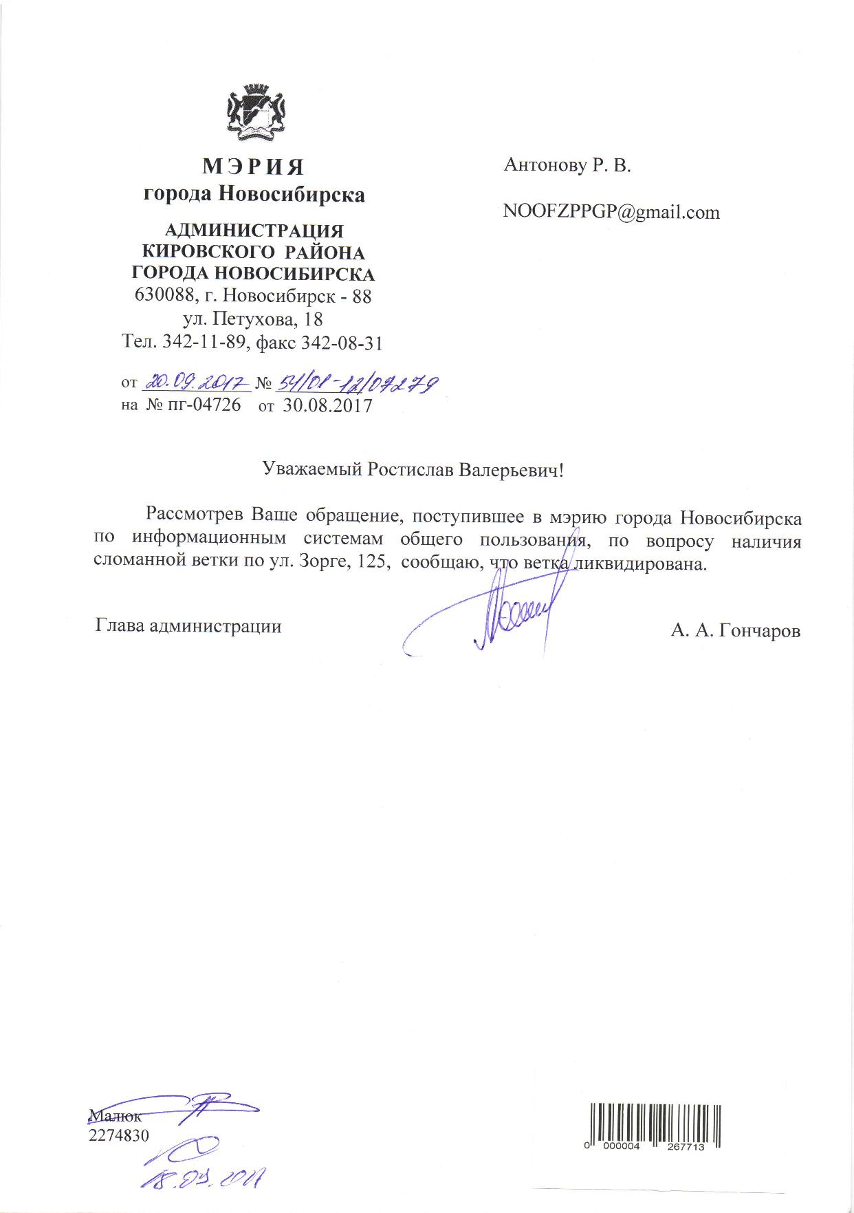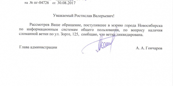 Номер жалобы:23979 Тип жалобы:Иные проблемы ЖКХ Название объекта:Управляющая Компания Город:Novosibirsk Адрес:Novosibirsk, улица Зорге, 125 Описание жалобы:Сломанная ветка Статус: