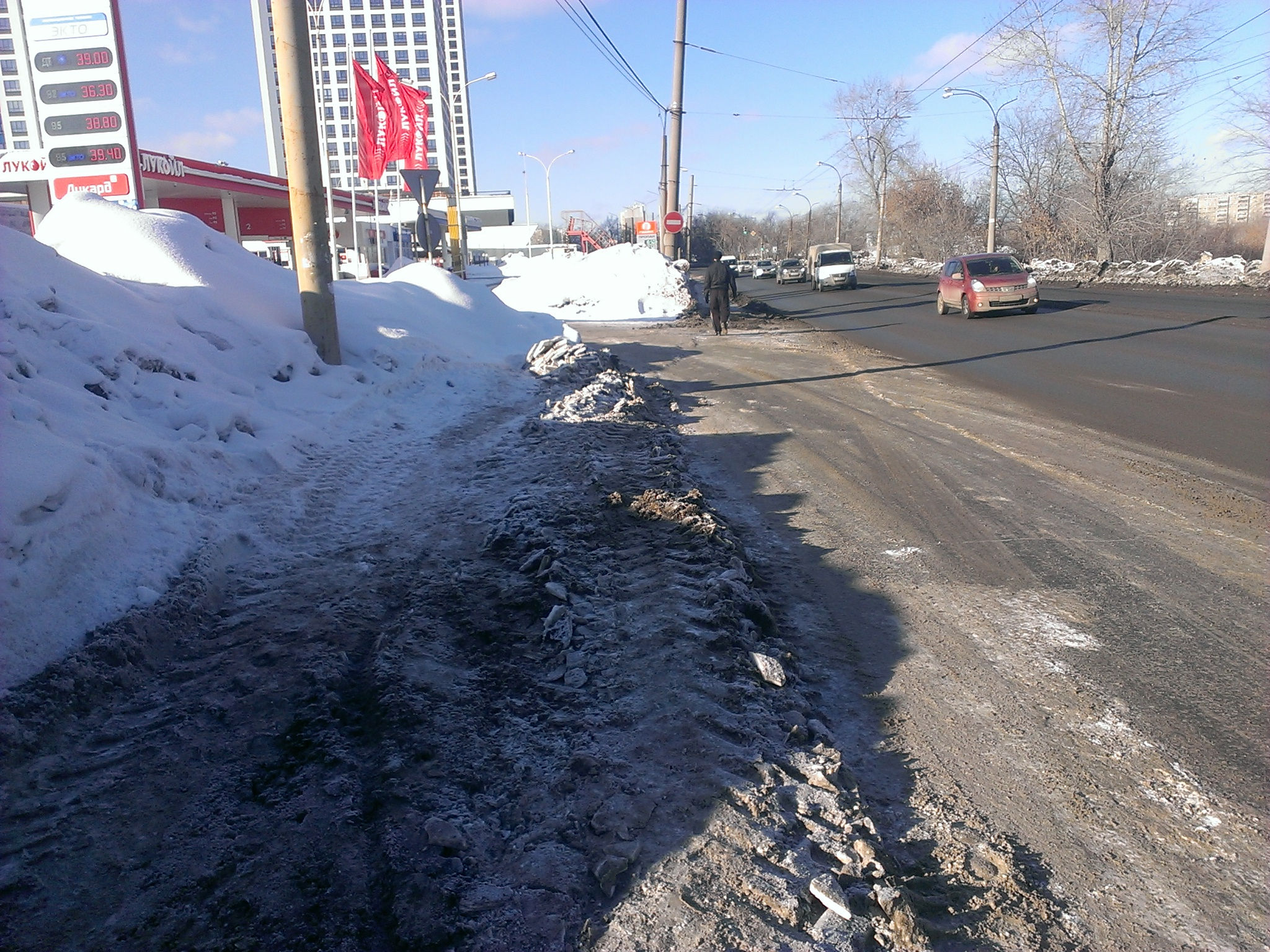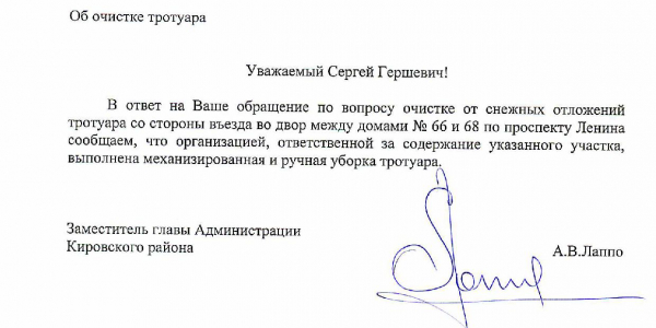 2) Отсутствует уборка снега на тротуаре вдоль чётной стороны Кузнецова от Машиностроителей до трамвайной остановки «Кузнецова» в направлении ДК Лаврова. Статус: