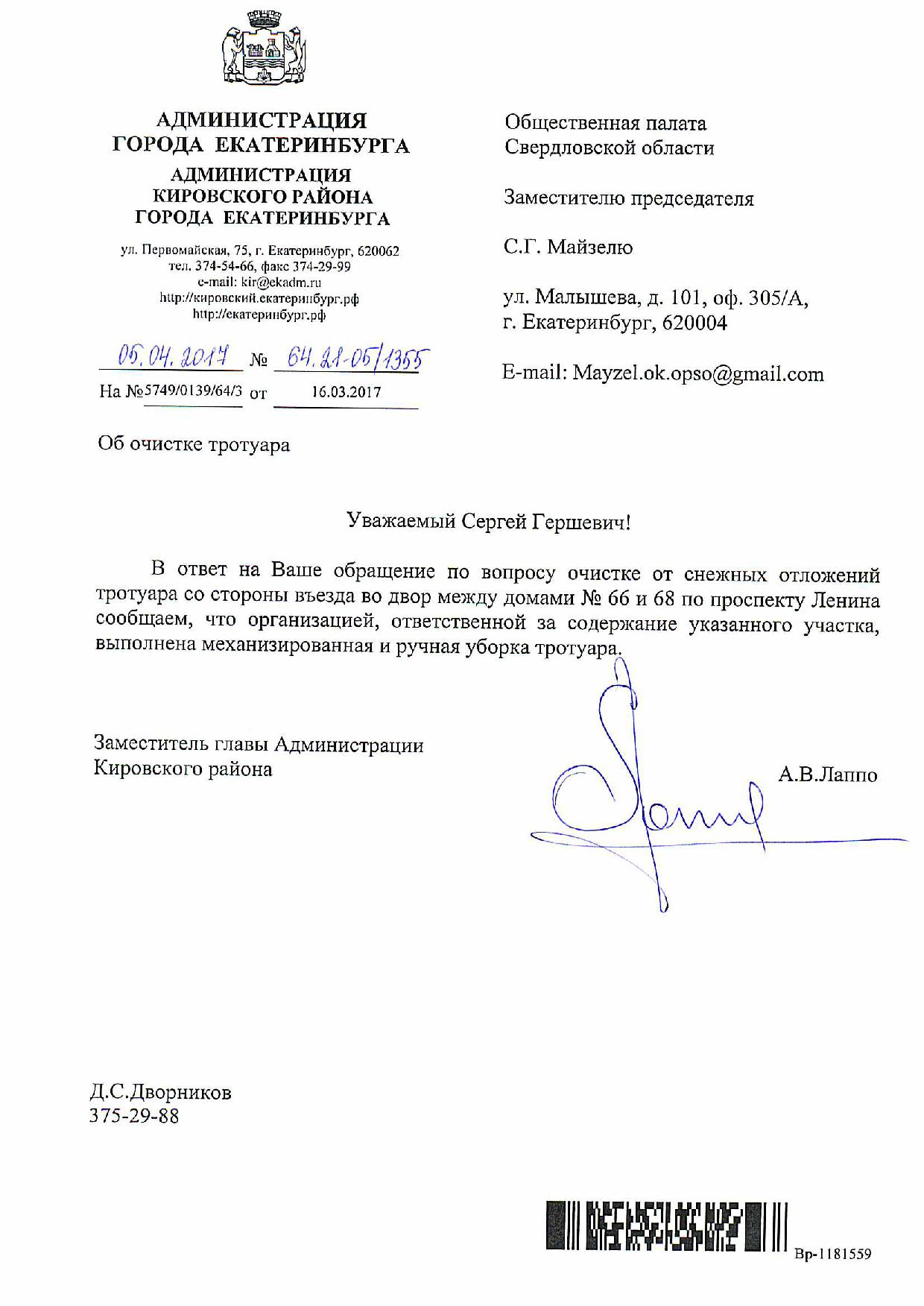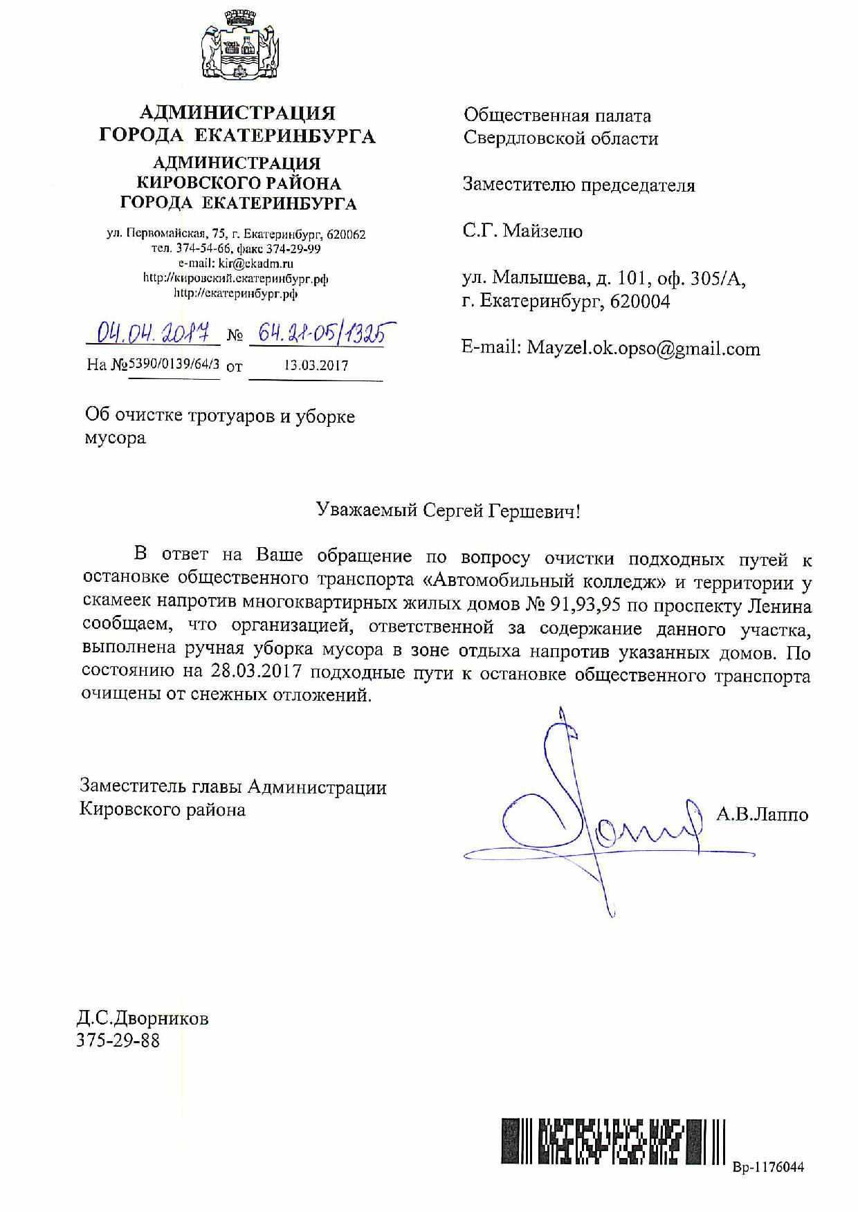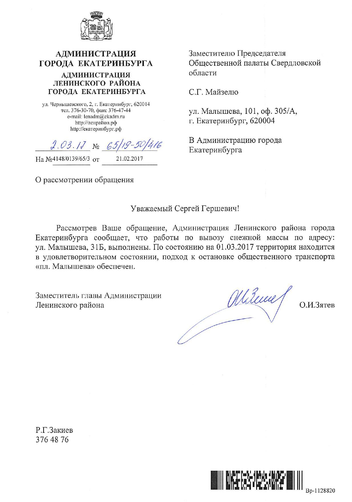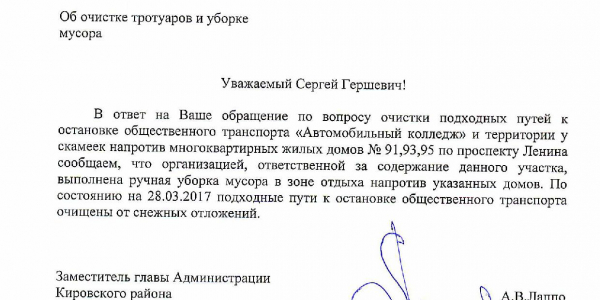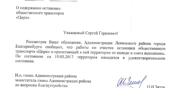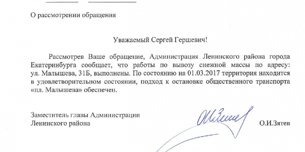Номер жалобы:15184 Тип жалобы:Качество уборки снега на тротуарах Название объекта:Администрация Екатеринбурга Регион:Свердловская область Город:Екатеринбург Адрес:проспект Ленина, 95 Описание жалобы:Отсутствует уборка зон со скамейками перед домами 91, 95, 97 и 99 по проспекту Ленина, а также подходов к автобусной остановке «Автомобильный колледж» в направлении Восточной. По данной проблеме я обращался в жалобе 14110. В ответе администрации сообщается, что работы по уборке выполнены. Данная информация не соответствует действительности. Необходимо произвести очистку снега в зонах со скамейками перед домами 91, 95, 97 и 99 по проспекту Ленина и на подходах к автобусной остановке «Автомобильный колледж» в направлении Восточной. Статус: