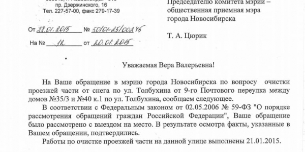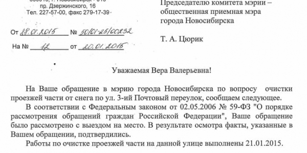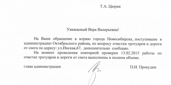 Номер жалобы:797 Тип жалобы:Качество уборки снега на дорогах Название объекта:Администрация Октябрьского Района Город:Новосибирск Адрес:Инская , 67 Описание жалобы:Во-первых, после чистки по краям проезжей части нагребли большие сугробы, из-за чего стало только хуже, сегодня выпал снова снег...и машины сразу забраковали плюс проезжая часть сильно сузилась. Снова появилась колея, утром идя на работу увидела картину сразу две машины застряли на проезжей части, проезд между домами Инская 67 и Большевиская 43, а также Инская 65 и Сакко и Ванцетти 11 Статус: