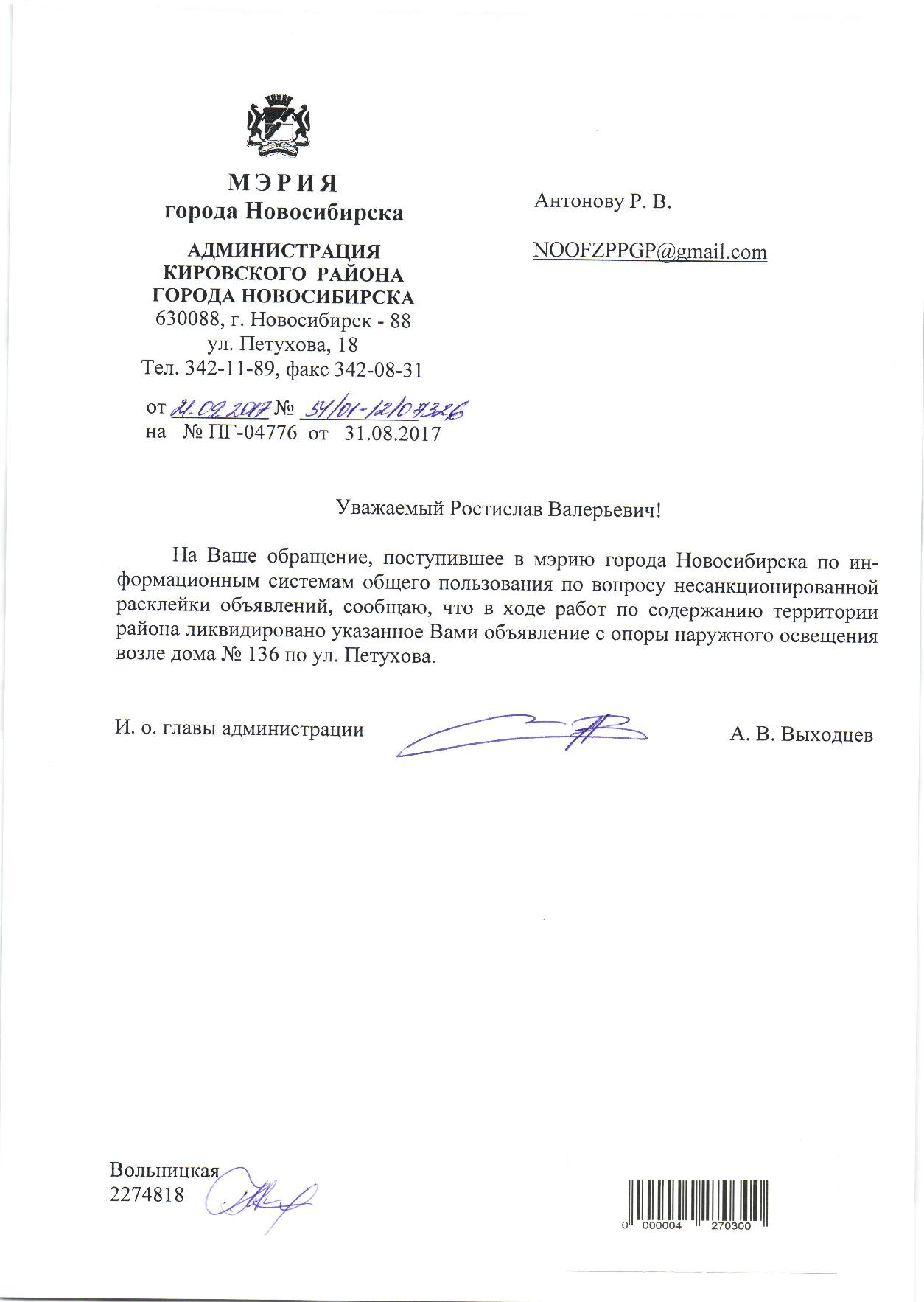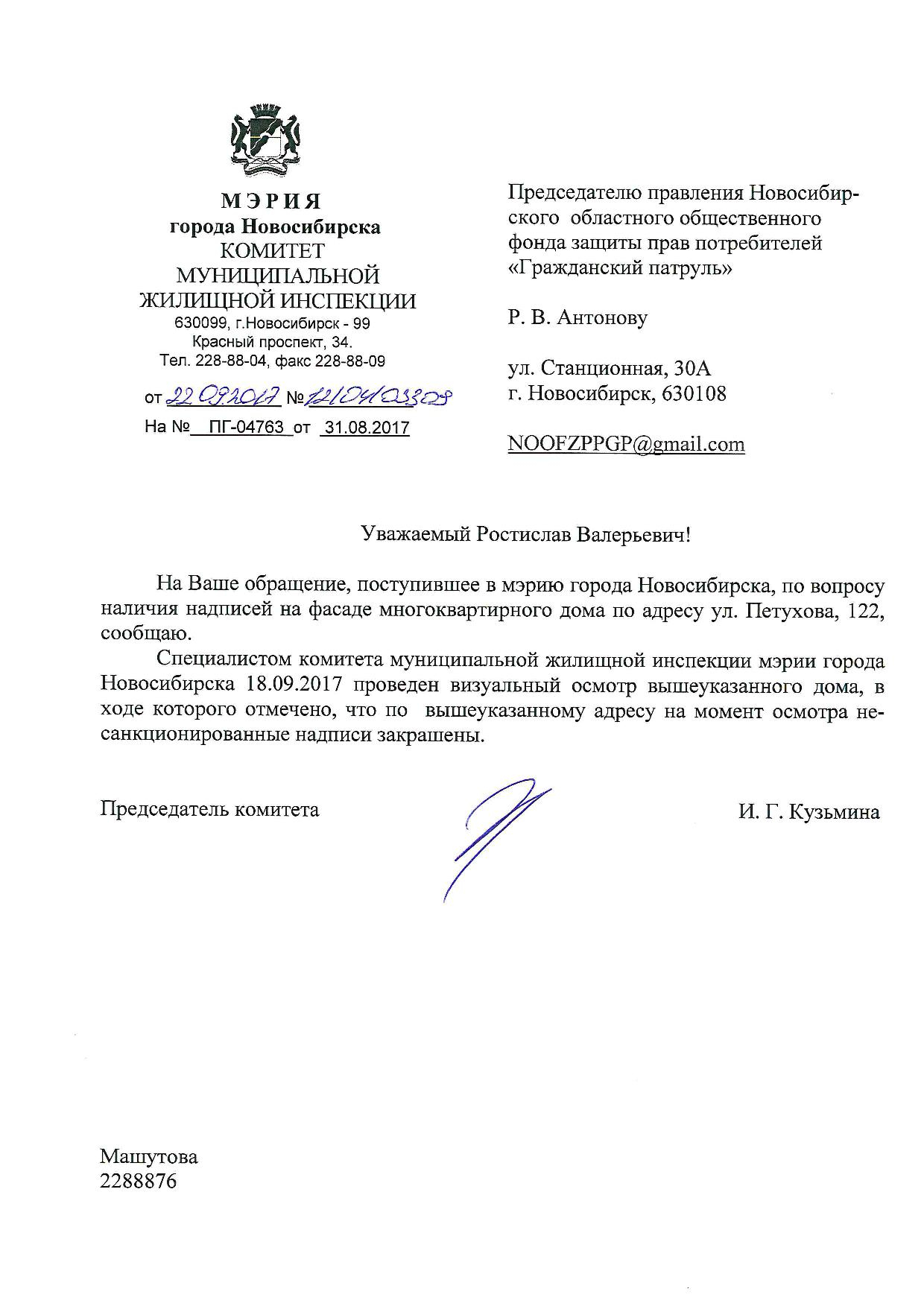 Номер жалобы:23968 Тип жалобы:Иные проблемы ЖКХ Название объекта:Управляющая Компания Город:Novosibirsk Адрес:Novosibirsk, улица Петухова, 122/2 Описание жалобы:Фасад разрисован Статус: