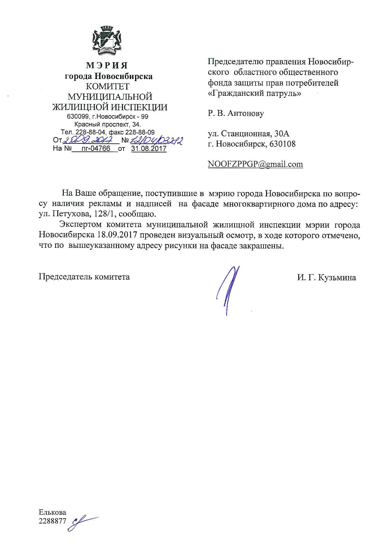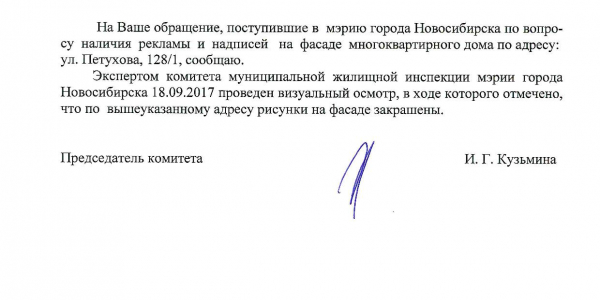 Номер жалобы:23966 Тип жалобы:Иные проблемы ЖКХ Название объекта:Управляющая Компания Город:Novosibirsk Адрес:Novosibirsk, улица Петухова, 128/1 Описание жалобы:Фасад разрисован Статус: