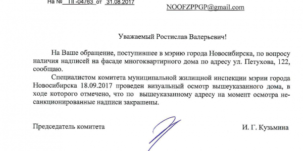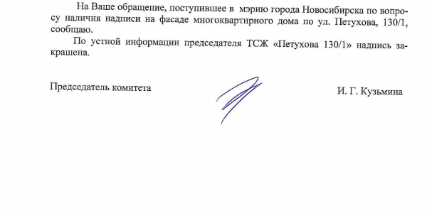 Номер жалобы:23965 Тип жалобы:Иные проблемы ЖКХ Название объекта:Управляющая Компания Город:Novosibirsk Адрес:Novosibirsk, улица Петухова, 130/1 Описание жалобы:Фасад разрисован Статус: