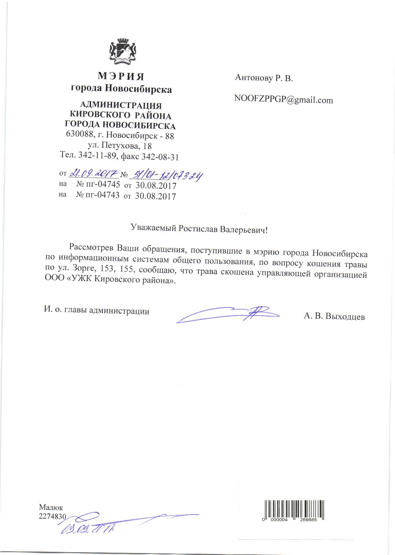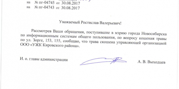 Номер жалобы:23945 Тип жалобы:Иные проблемы ЖКХ Название объекта:Управляющая Компания Город:Novosibirsk Адрес:Novosibirsk, улица Зорге, 153 Описание жалобы:Высокая трава Статус: