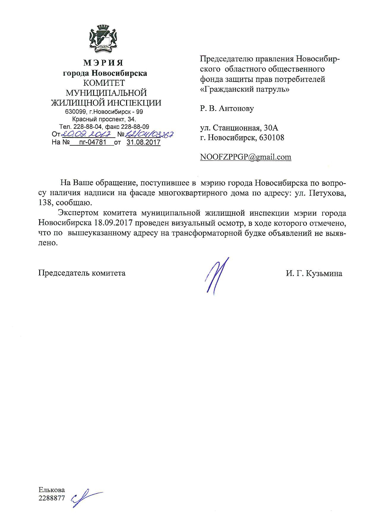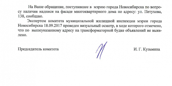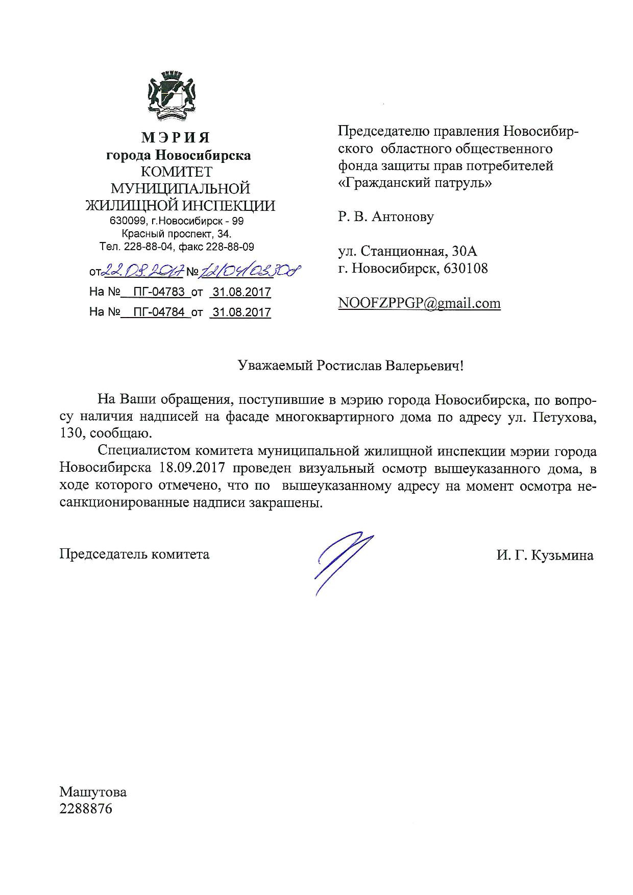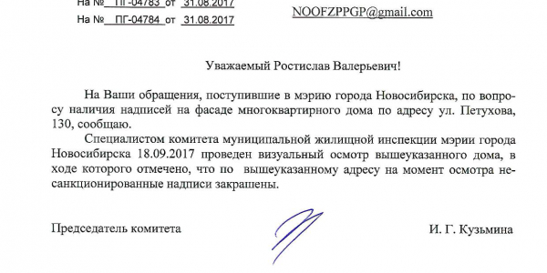 Номер жалобы:23951 Тип жалобы:Иные проблемы ЖКХ Название объекта:Управляющая Компания Город:Novosibirsk Адрес:Novosibirsk, улица Петухова, 130 Описание жалобы:Петухова 130, разрисован фасад Статус: