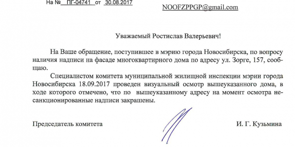 Номер жалобы:23950 Тип жалобы:Иные проблемы ЖКХ Название объекта:Управляющая Компания Город:Novosibirsk Адрес:Novosibirsk, улица Зорге, 141 Описание жалобы:Фасад разрисован Статус: