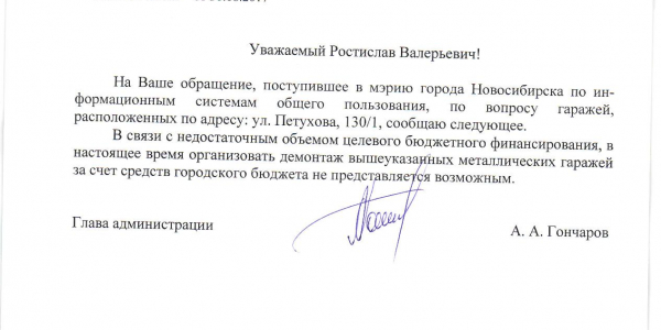 Номер жалобы:23953 Тип жалобы:Иные проблемы ЖКХ Название объекта:Управляющая Компания Город:Novosibirsk Адрес:Novosibirsk, улица Петухова, 130/1 Описание жалобы:Гаражи Статус: