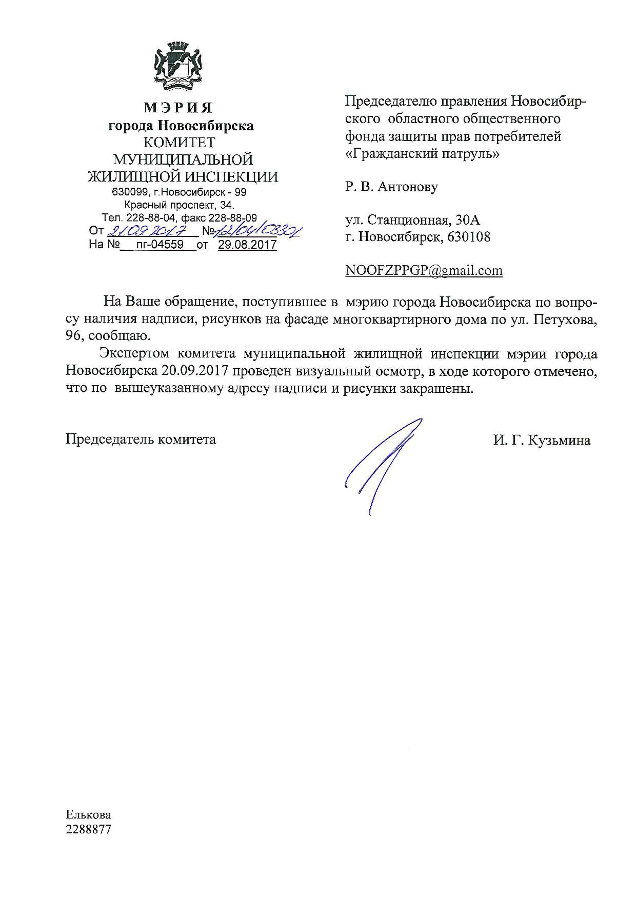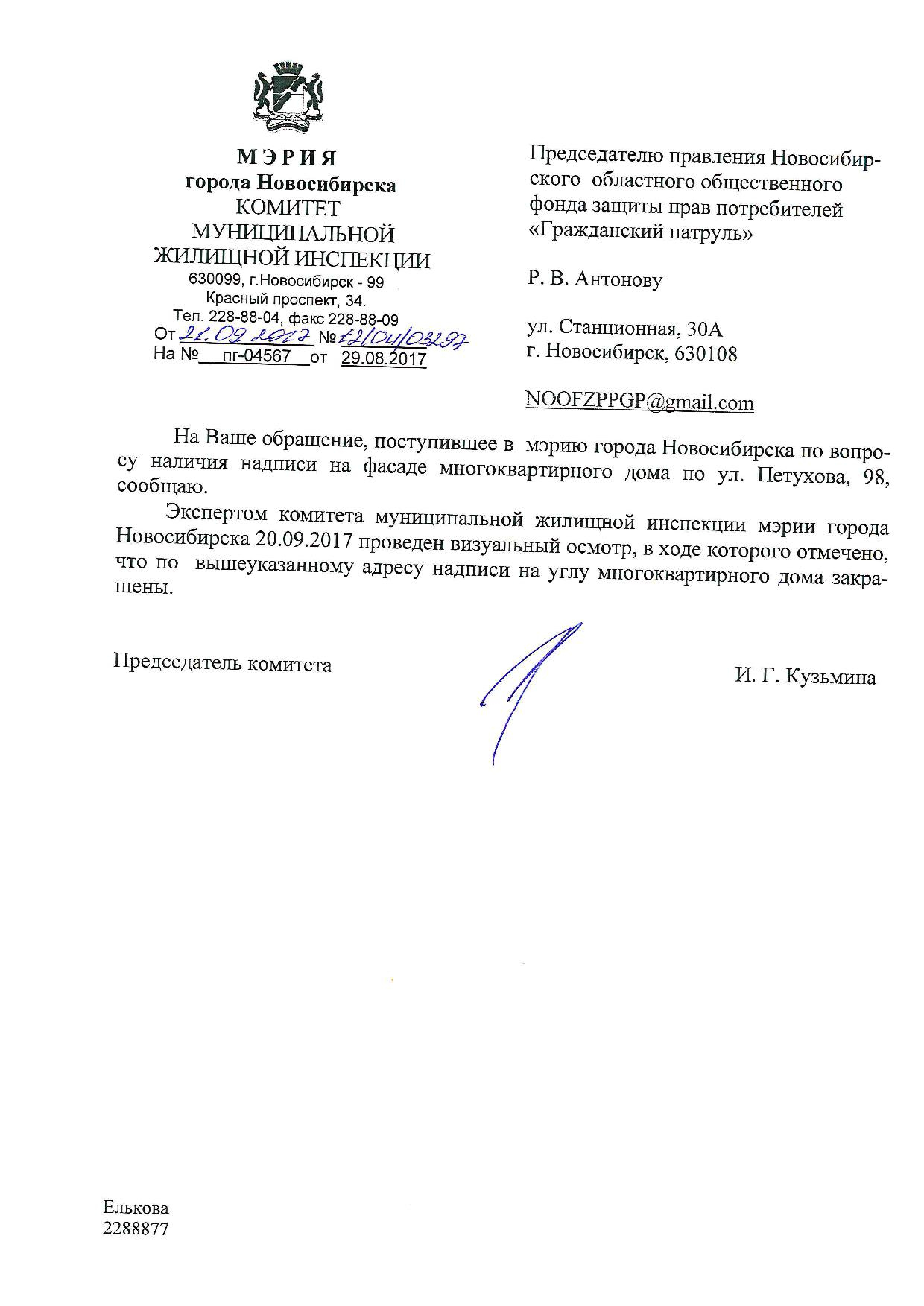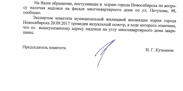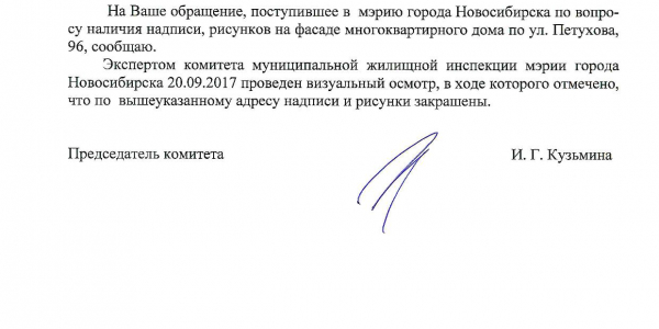 Номер жалобы:23799 Тип жалобы:Иные проблемы ЖКХ Название объекта:Управляющая Компания Город:Новосибирск Адрес:Новосибирск, улица Петухова, 96 Описание жалобы:Фасад дома разрисован Статус: