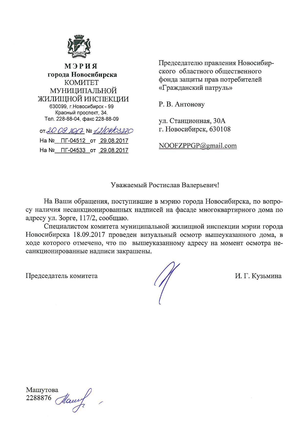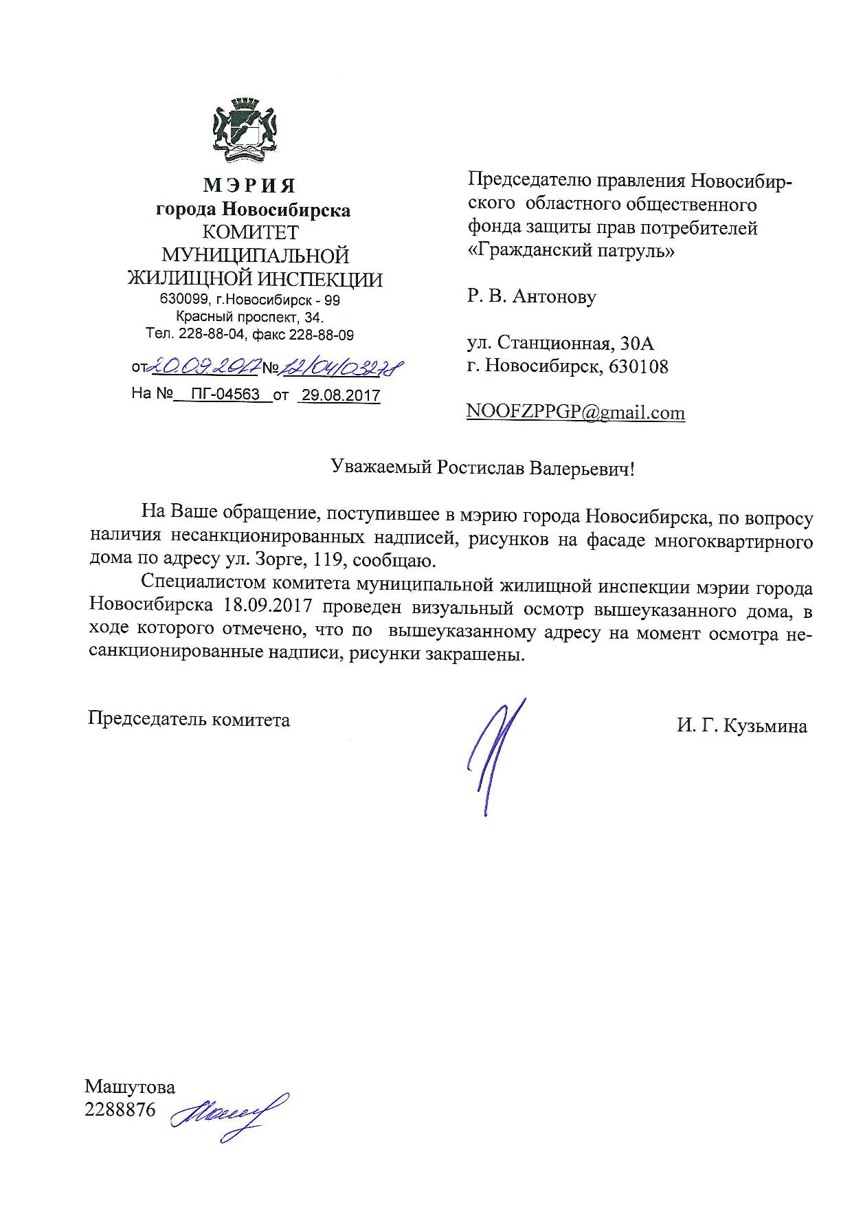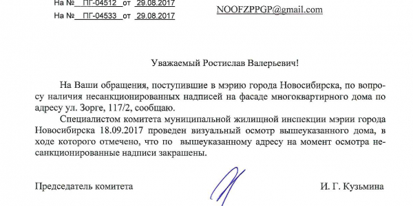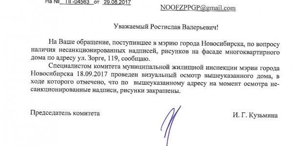Номер жалобы:23798 Тип жалобы:Иные проблемы ЖКХ Название объекта:Управляющая Компания Город:Новосибирск Адрес:Новосибирск, улица Зорге, 119 Описание жалобы:Фасад разрисован Статус: