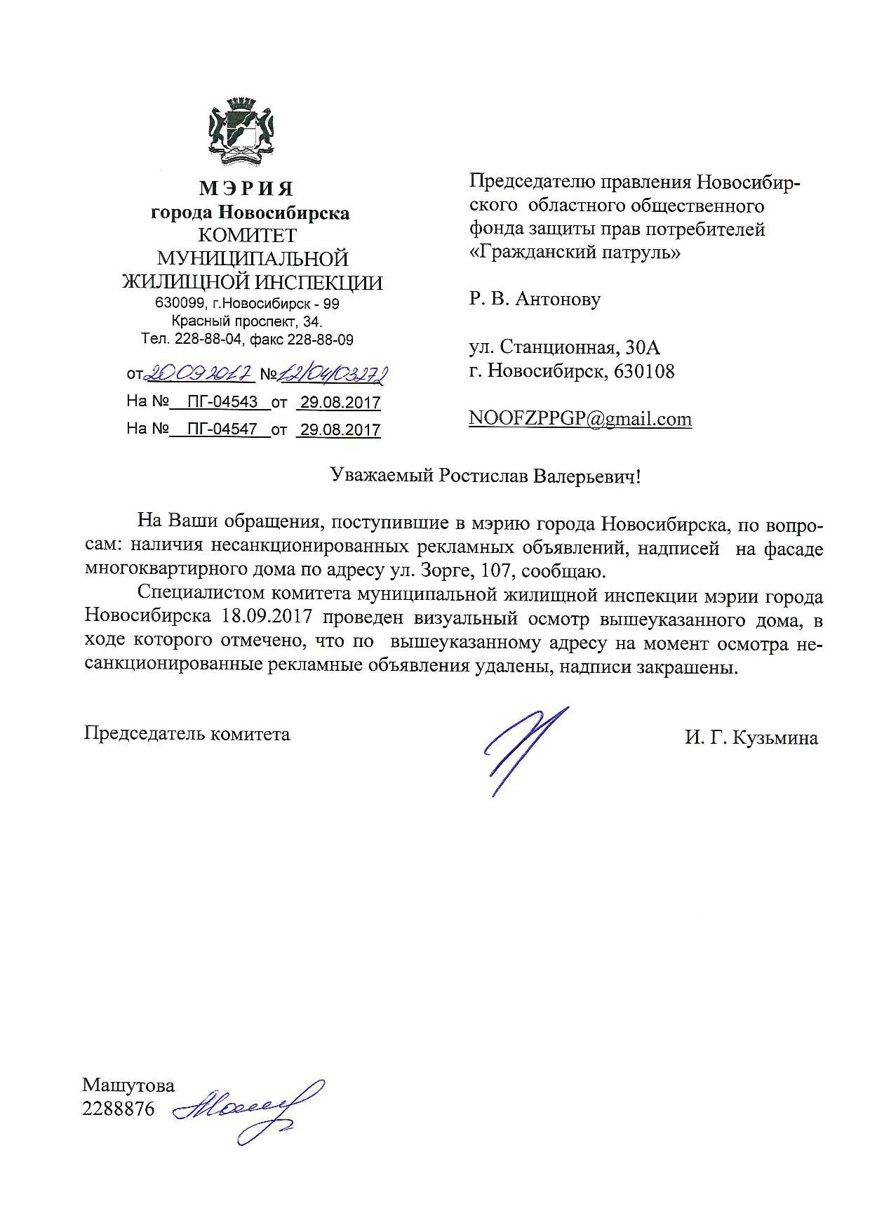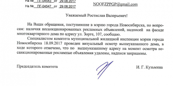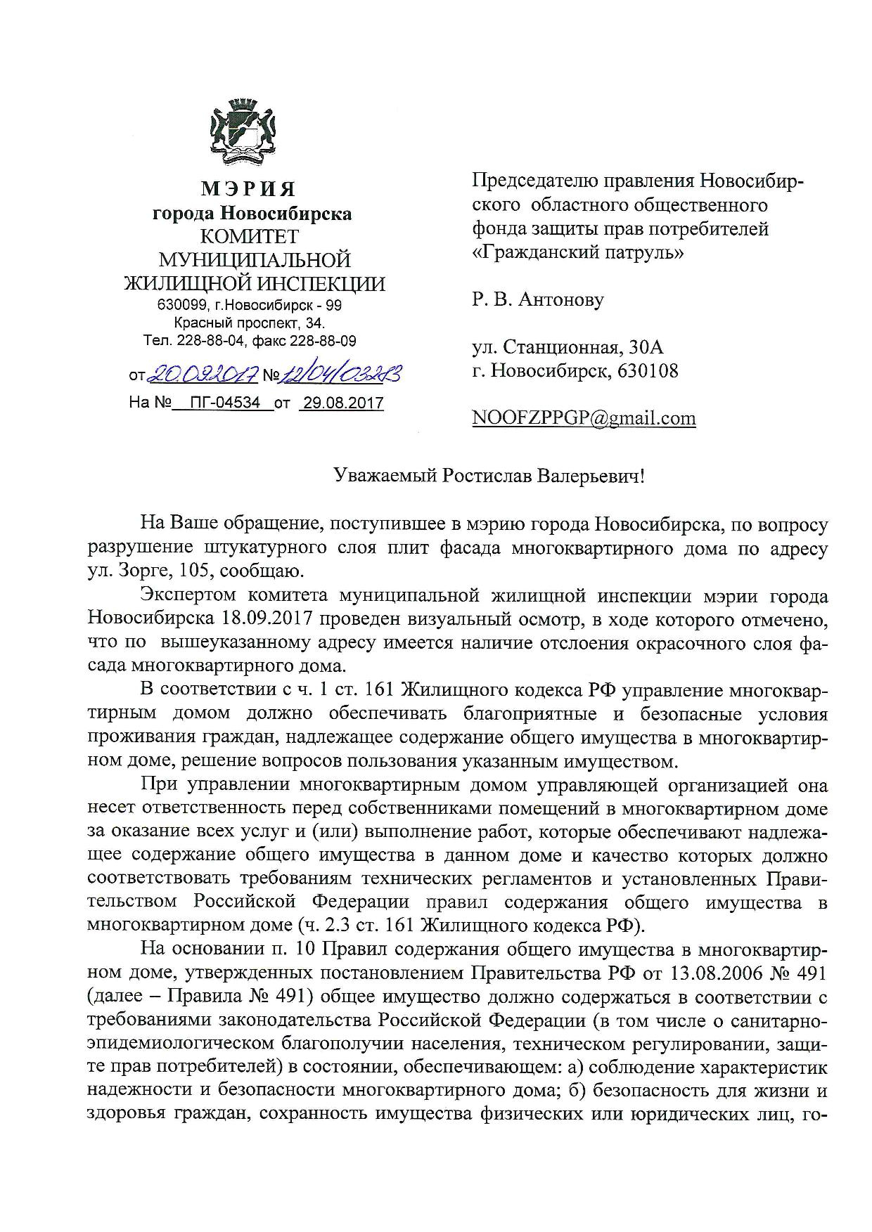 Номер жалобы:23803 Тип жалобы:Иные проблемы ЖКХ Название объекта:Управляющая Компания Город:Новосибирск Адрес:Новосибирск, улица Зорге, 107 Описание жалобы:Фасад разрисован Статус: