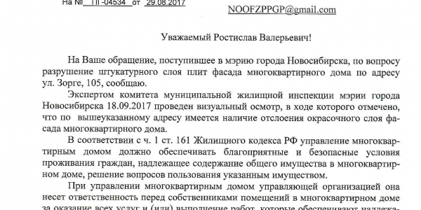 Номер жалобы:23804 Тип жалобы:Иные проблемы ЖКХ Название объекта:Управляющая Компания Город:Новосибирск Адрес:Новосибирск, улица Зорге, 105 Описание жалобы:Отваливающаяся штукатурка Статус: