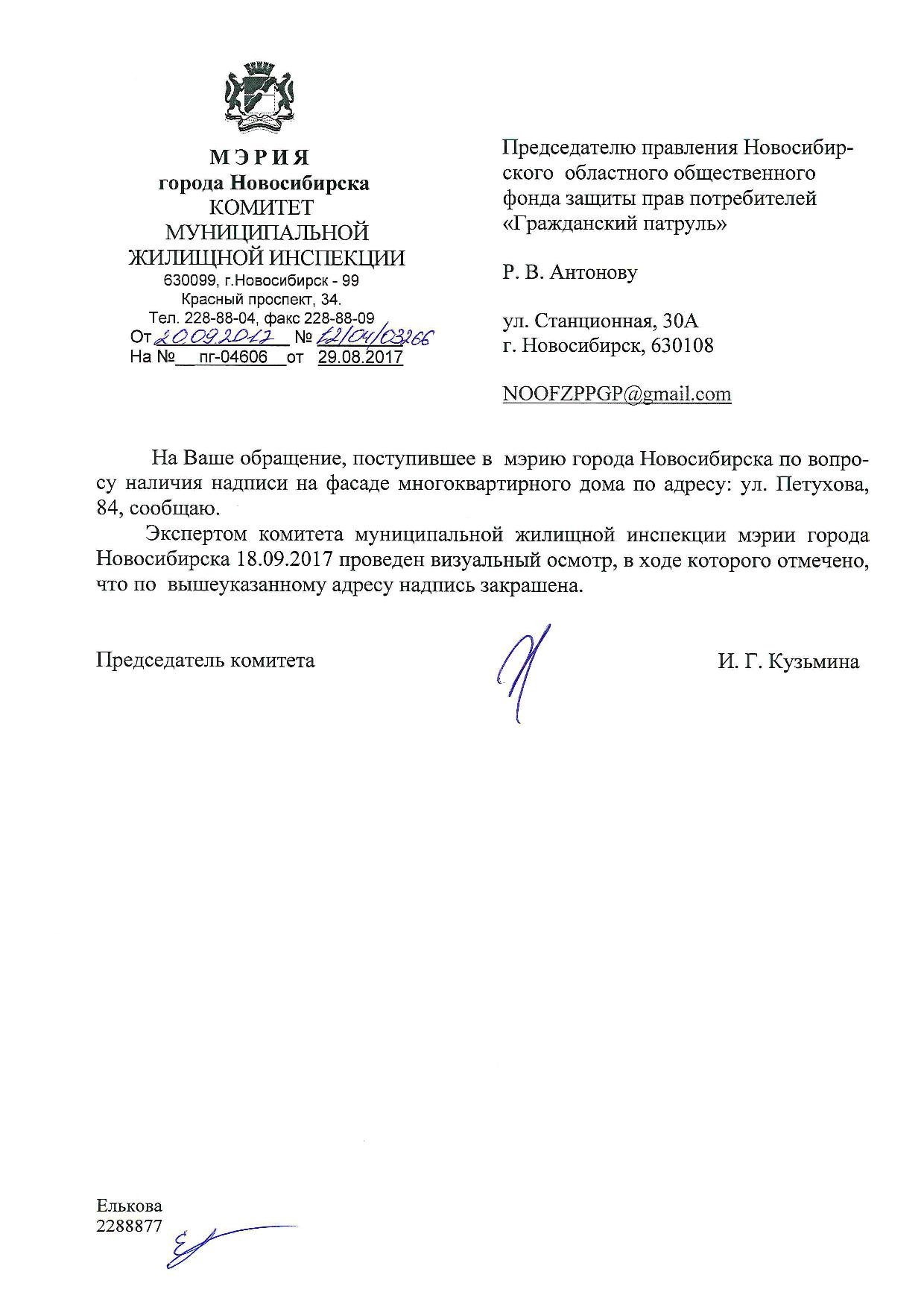 Номер жалобы:23783 Тип жалобы:Иные проблемы ЖКХ Название объекта:Управляющая Компания Город:Новосибирск Адрес:Новосибирск, улица Петухова, 84 Описание жалобы:Разрисован фасад дома Статус: