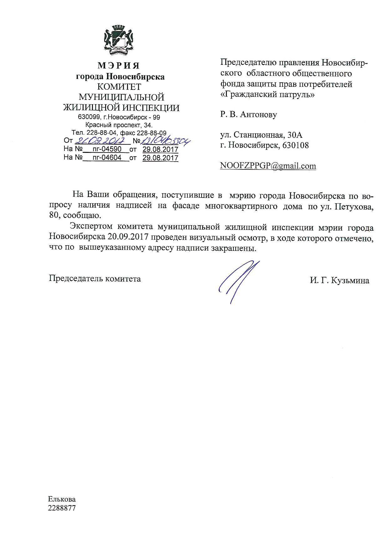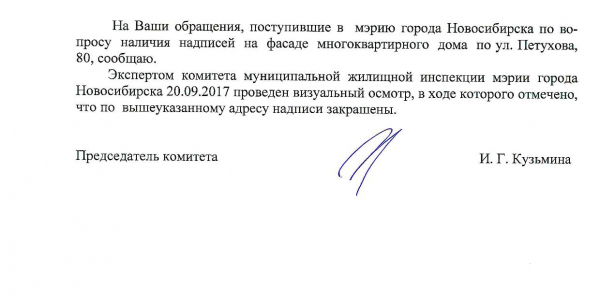 Номер жалобы:23784 Тип жалобы:Иные проблемы ЖКХ Название объекта:Управляющая Компания Город:Новосибирск Адрес:Новосибирск, улица Петухова, 80 Описание жалобы:Фасад разрисован Статус:
