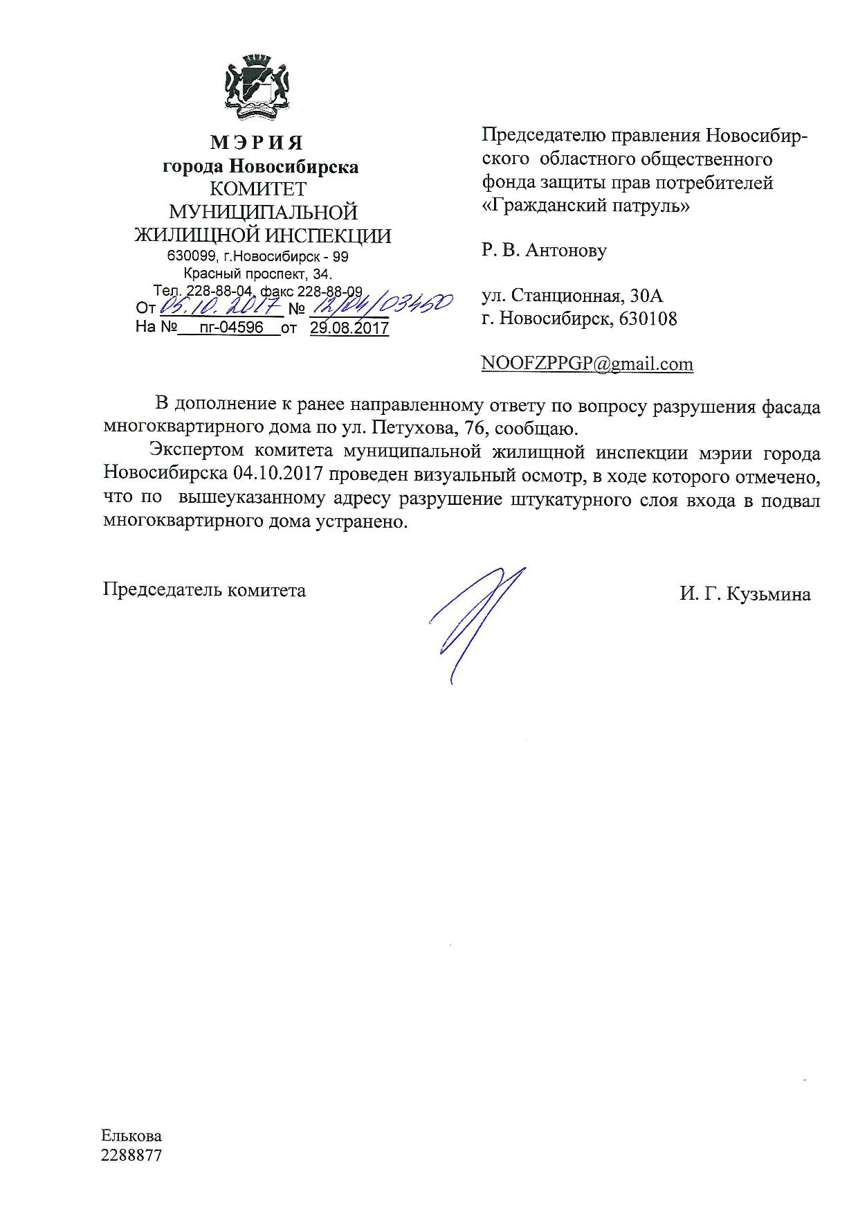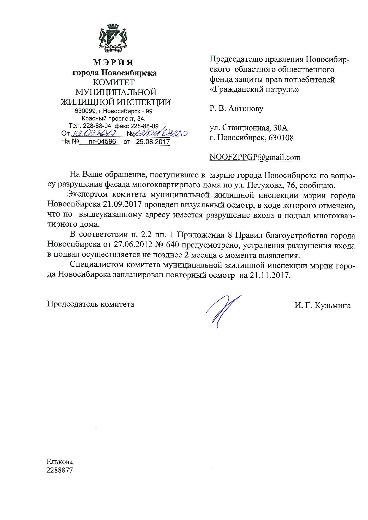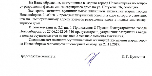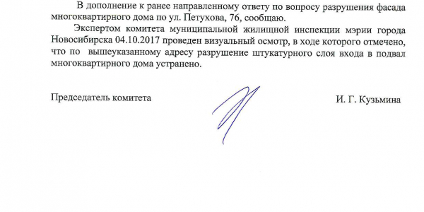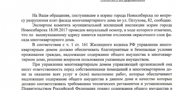 Номер жалобы:23787 Тип жалобы:Иные проблемы ЖКХ Название объекта:Управляющая Компания Город:Новосибирск Адрес:Новосибирск, улица Петухова, 76 Описание жалобы:Рушится фасад дома Статус: