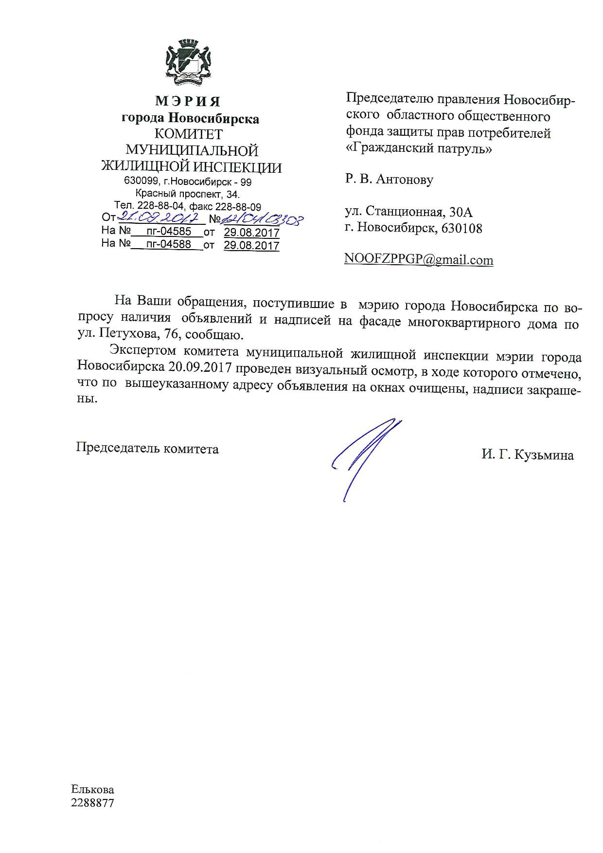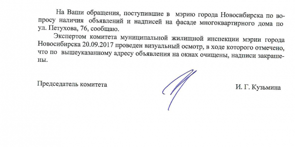 Номер жалобы:23789 Тип жалобы:Иные проблемы ЖКХ Название объекта:Управляющая Компания Город:Новосибирск Адрес:Новосибирск, улица Петухова, 76 Описание жалобы:Комментарий Статус: