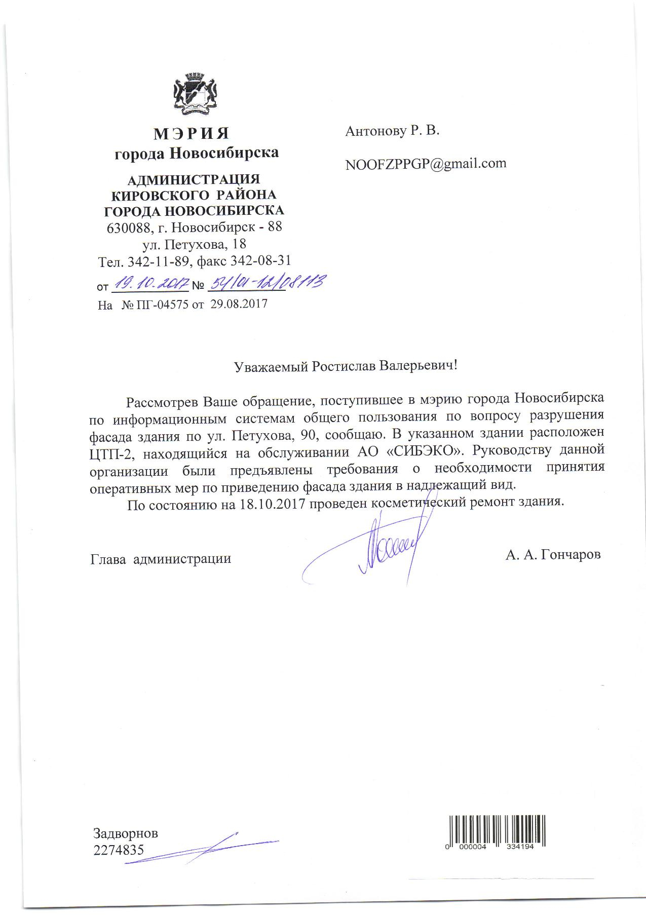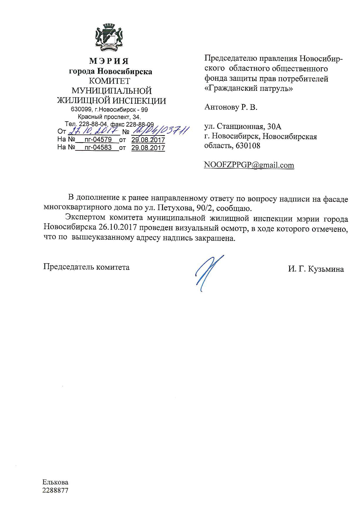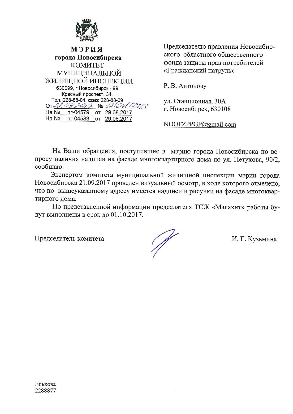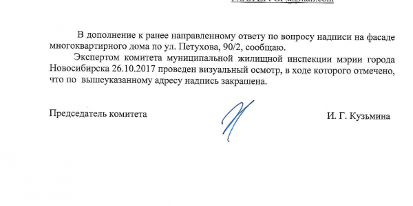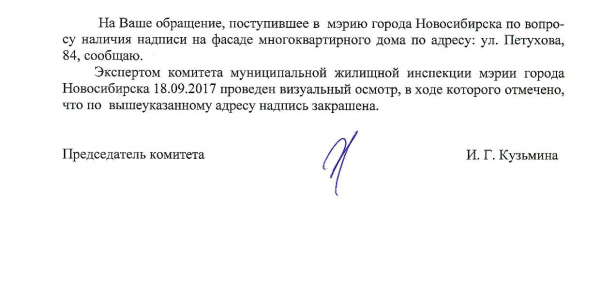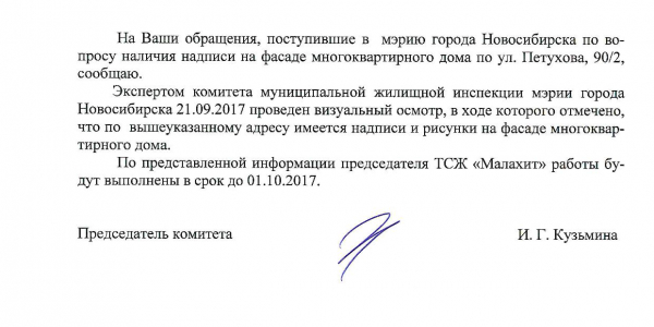Номер жалобы:23790 Тип жалобы:Иные проблемы ЖКХ Название объекта:Управляющая Компания Город:Новосибирск Адрес:Новосибирск, улица Петухова, 90/2 Описание жалобы:Фасад разрисован Статус: