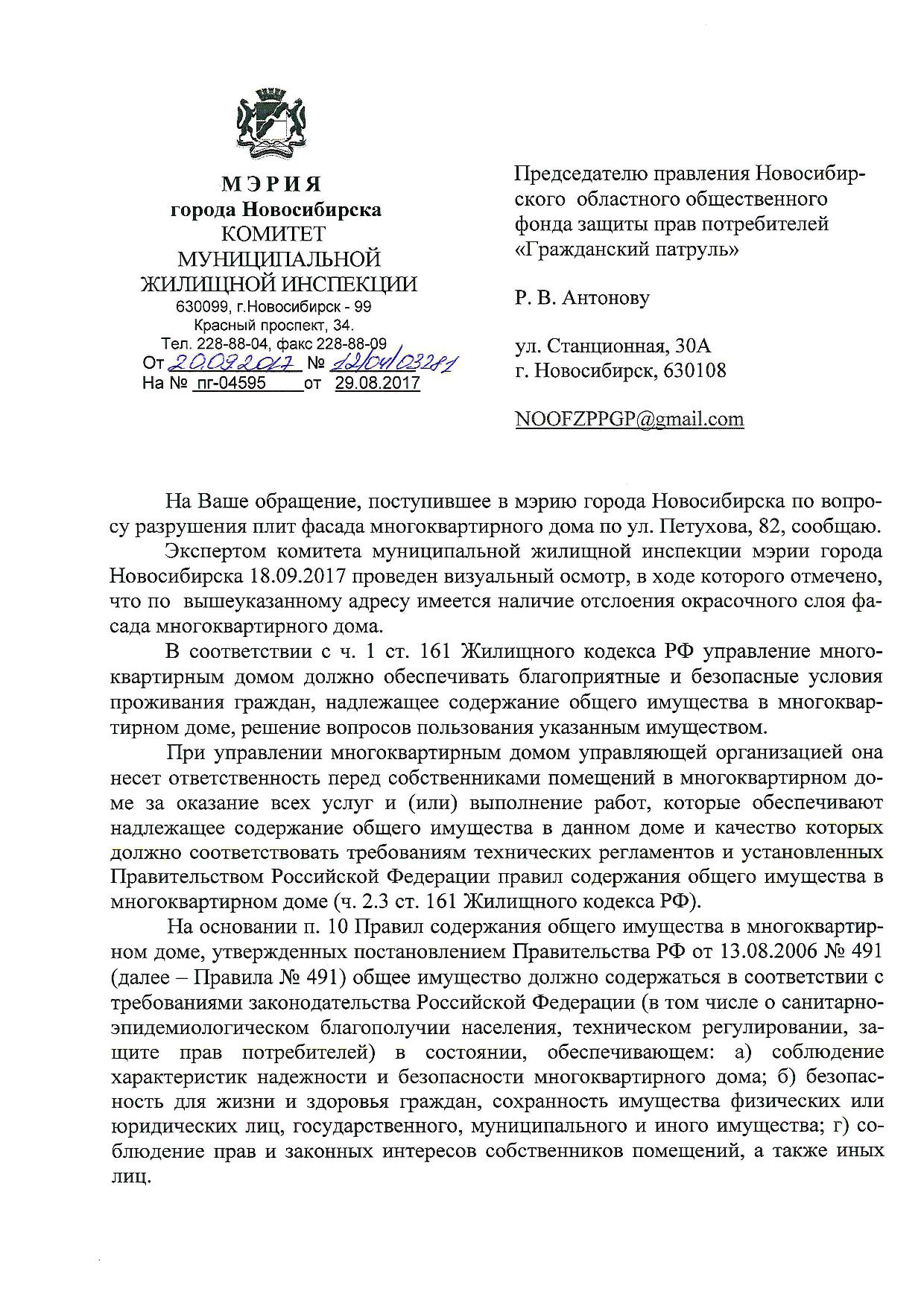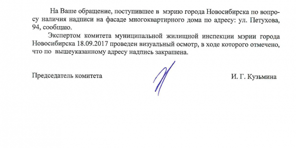 Номер жалобы:23796 Тип жалобы:Иные проблемы ЖКХ Название объекта:Управляющая Компания Город:Новосибирск Адрес:Новосибирск, улица Петухова, 94 Описание жалобы:Фасад разрисован Статус: