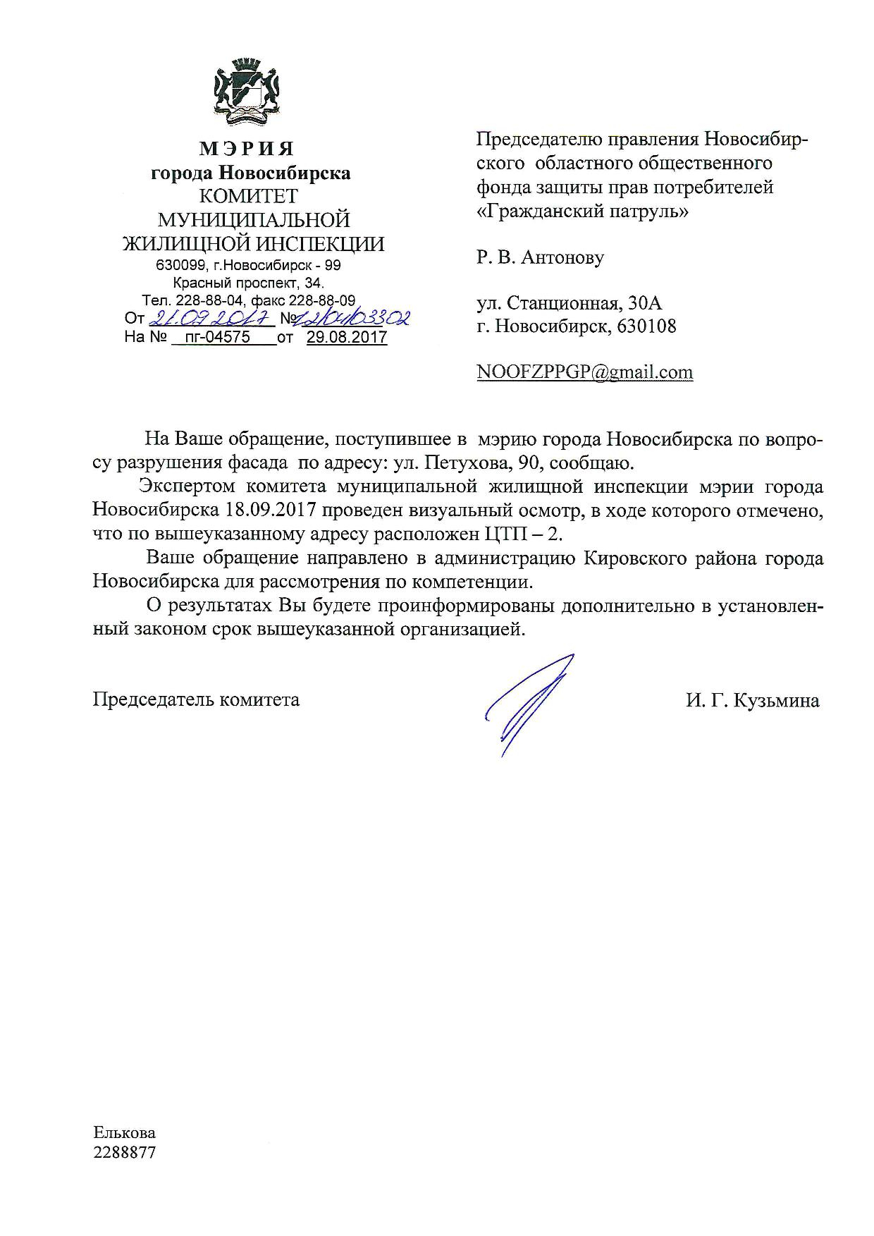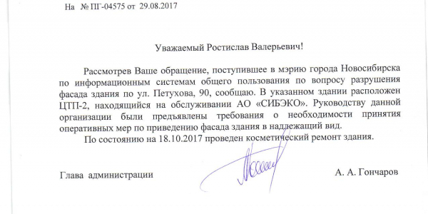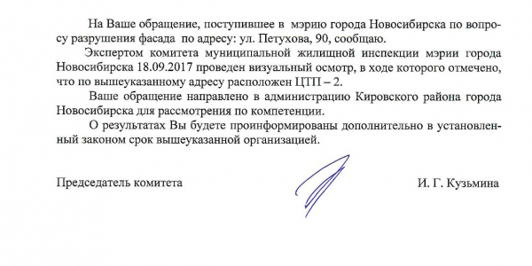 Номер жалобы:23794 Тип жалобы:Иные проблемы ЖКХ Название объекта:Управляющая Компания Город:Новосибирск Адрес:Новосибирск, улица Петухова, 90 Описание жалобы:Рушится фасад Статус: