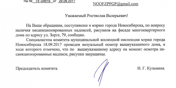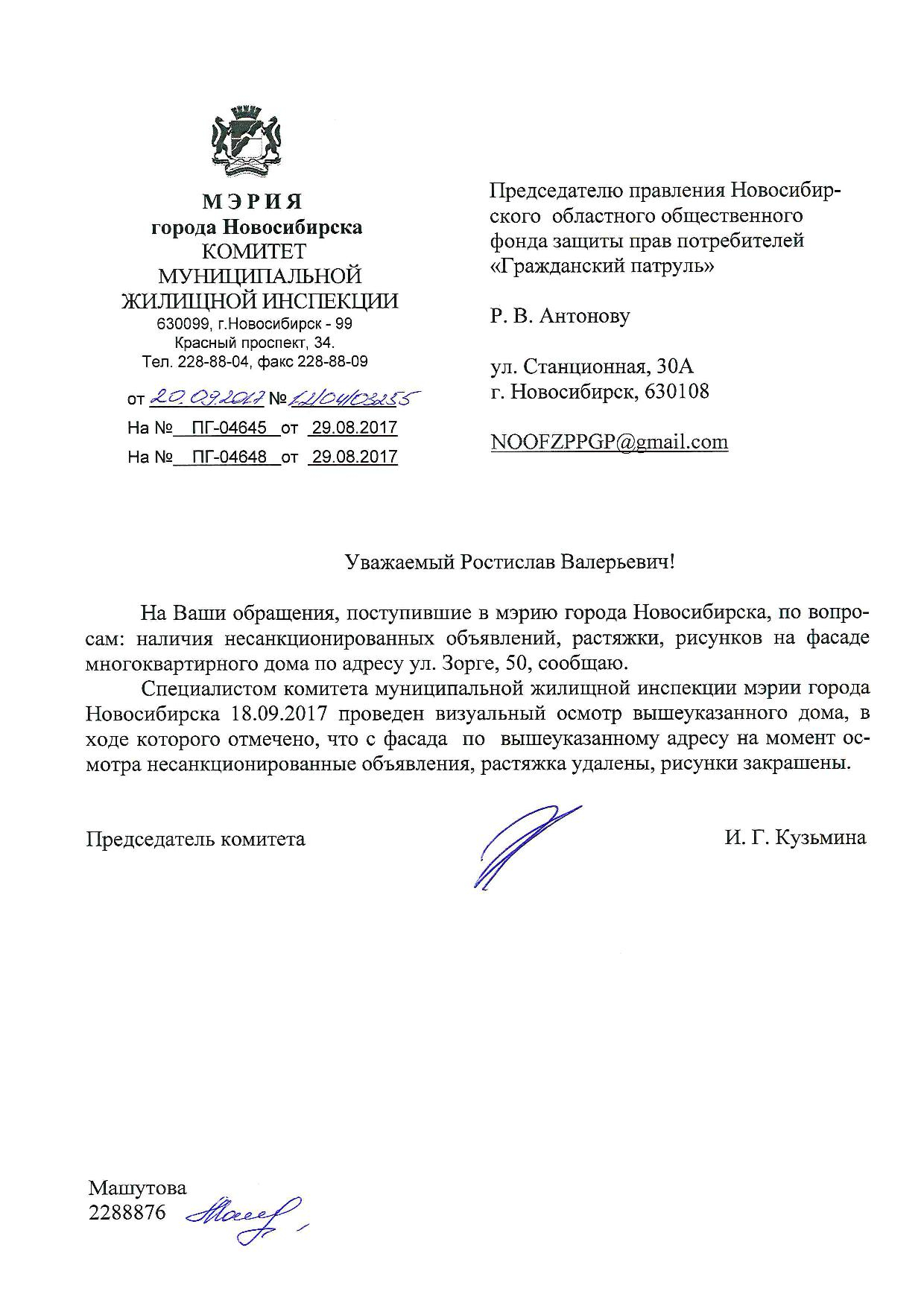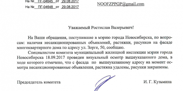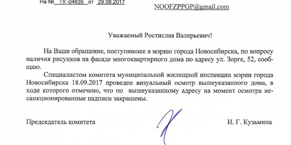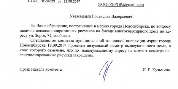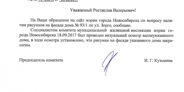 Номер жалобы:23760 Тип жалобы:Иные проблемы ЖКХ Название объекта:Управляющая Компания Город:Новосибирск Адрес:Новосибирск, улица Зорге, 50 Описание жалобы:Фасад разрисован Статус: