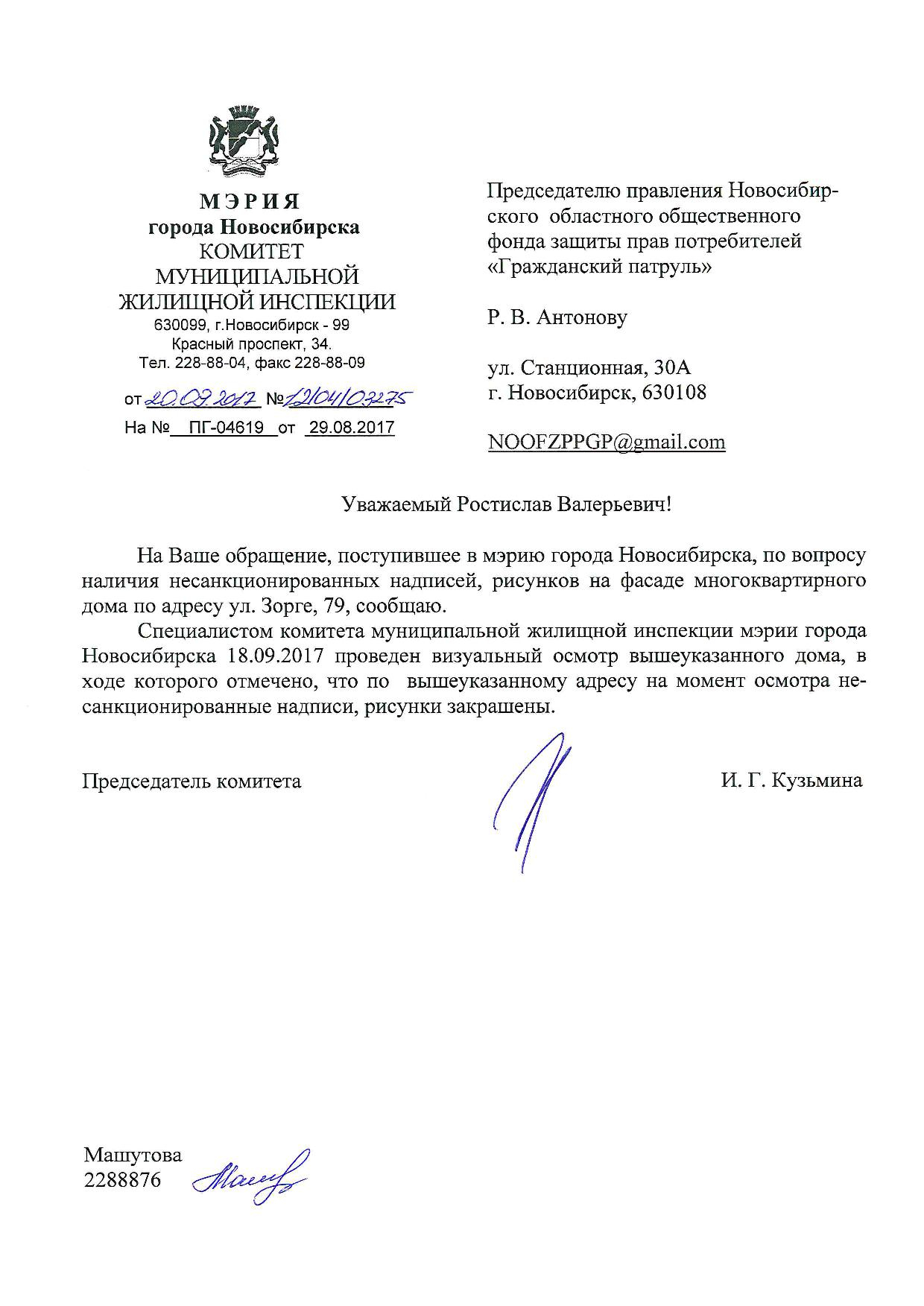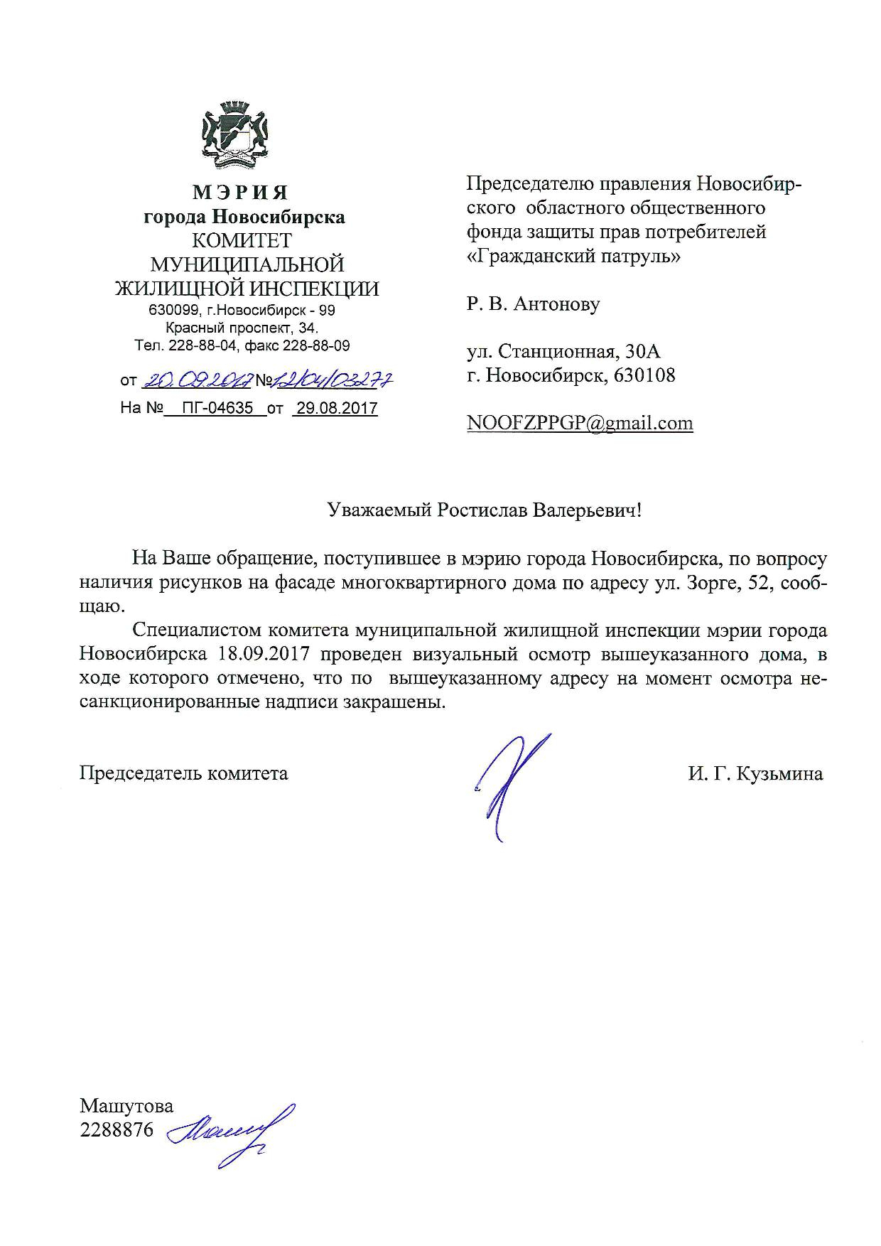 Номер жалобы:23761 Тип жалобы:Иные проблемы ЖКХ Название объекта:Управляющая Компания Город:Новосибирск Адрес:Новосибирск, улица Зорге, 52 Описание жалобы:Фасад разрисован Статус:
