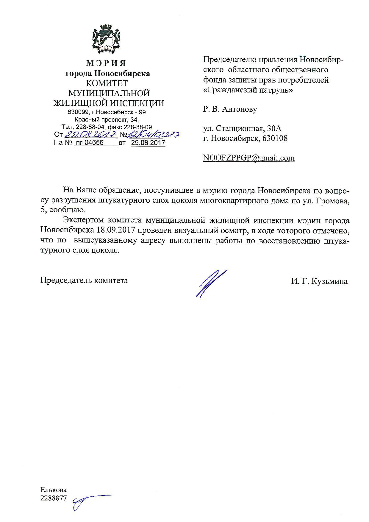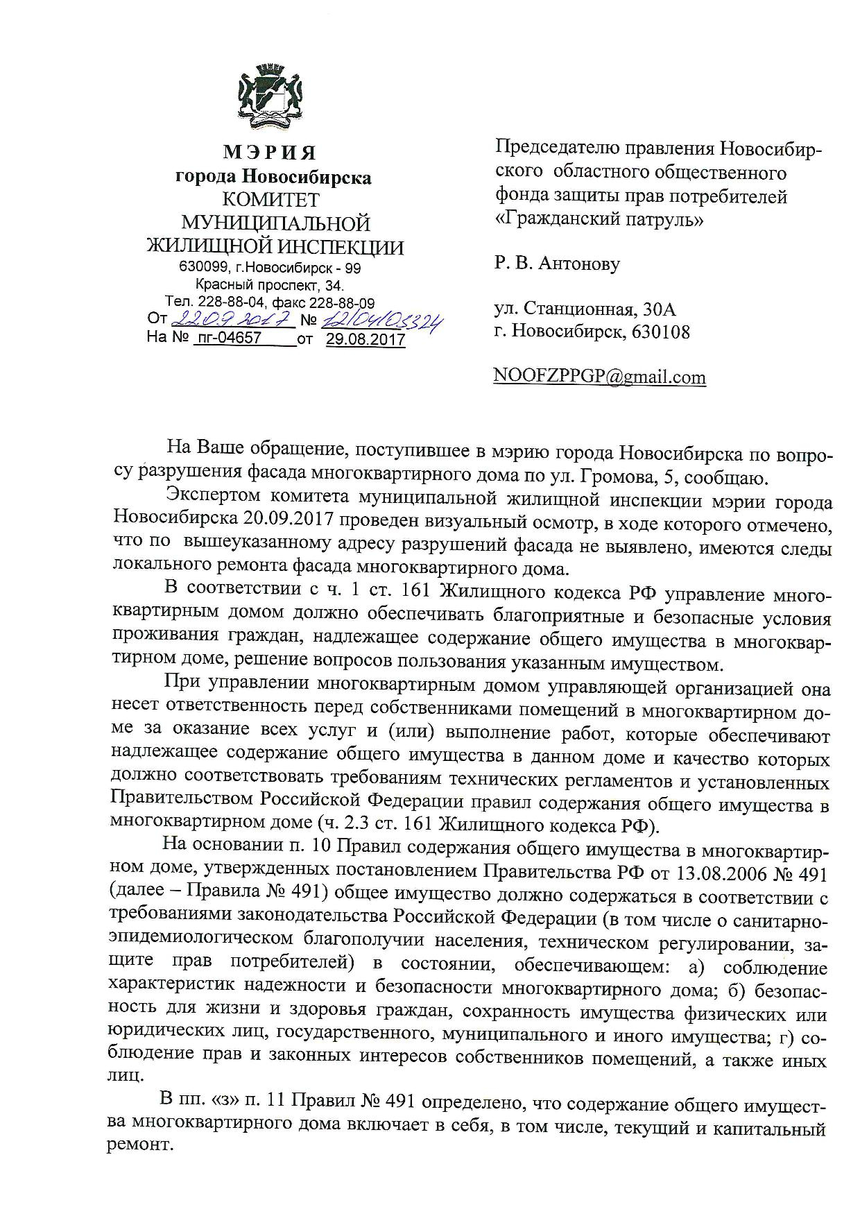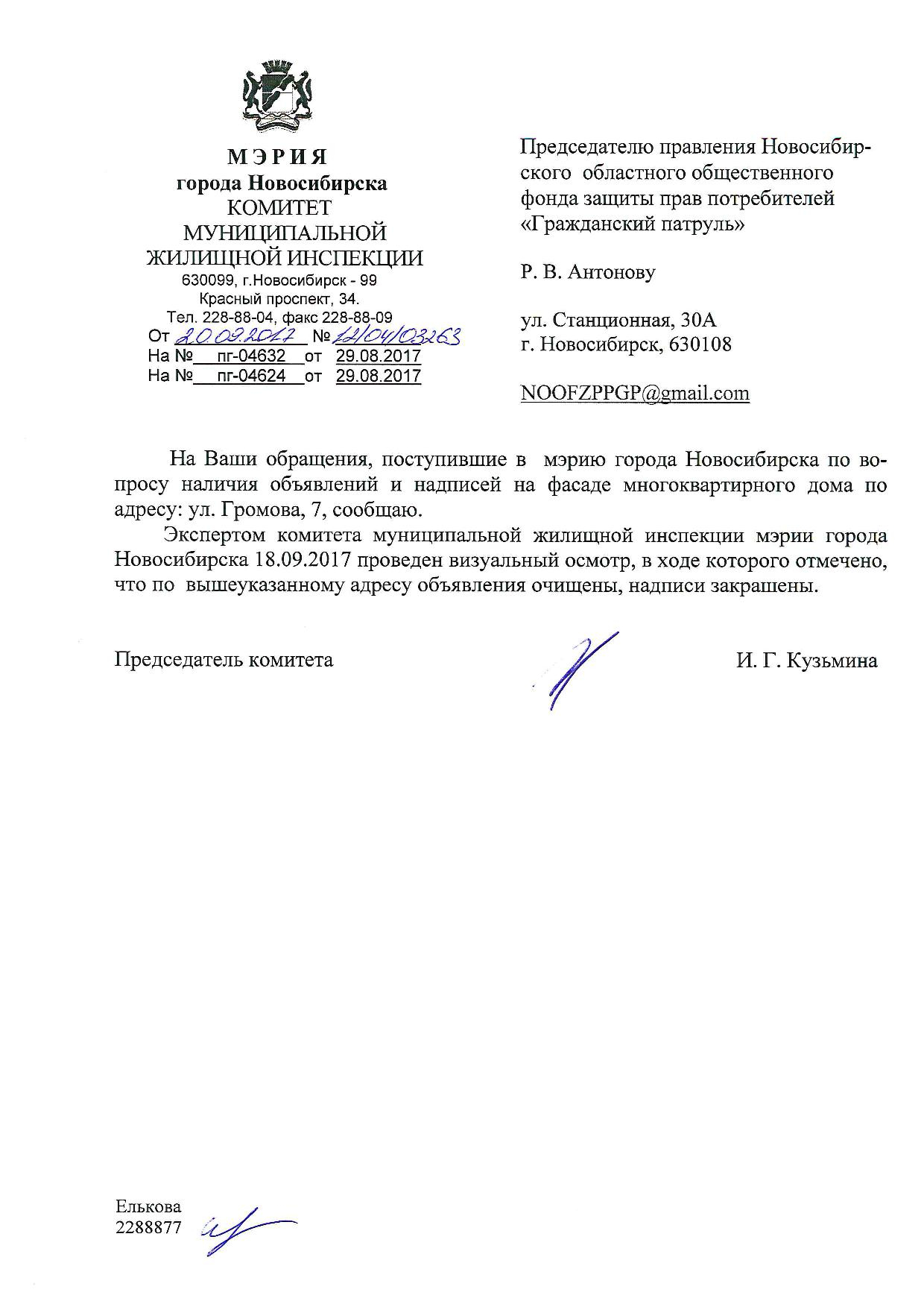 Номер жалобы:23771 Тип жалобы:Иные проблемы ЖКХ Название объекта:Управляющая Компания Город:Новосибирск Адрес:Новосибирск, улица Громова, 7 Описание жалобы:Громова 7,фасад разрисован Статус: